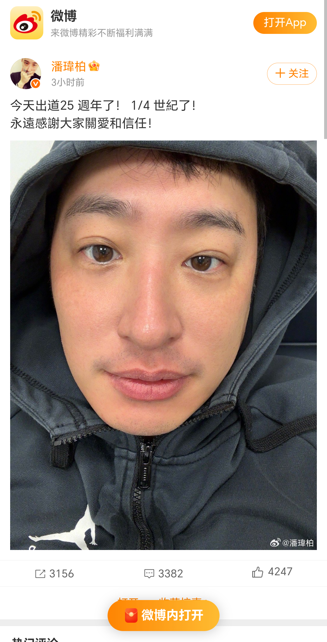 潘玮柏出道25周年发文潘玮柏出道25年了二十五年,四分之一个世纪。从反转地球到狂