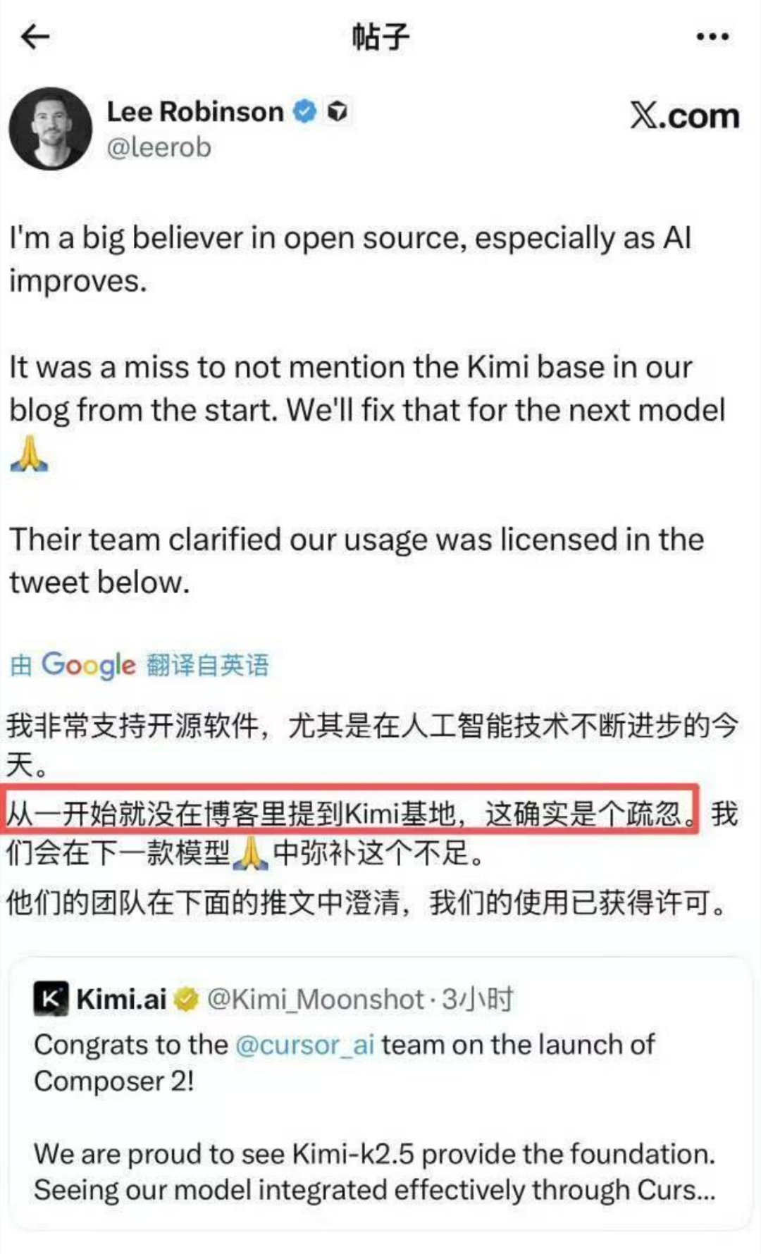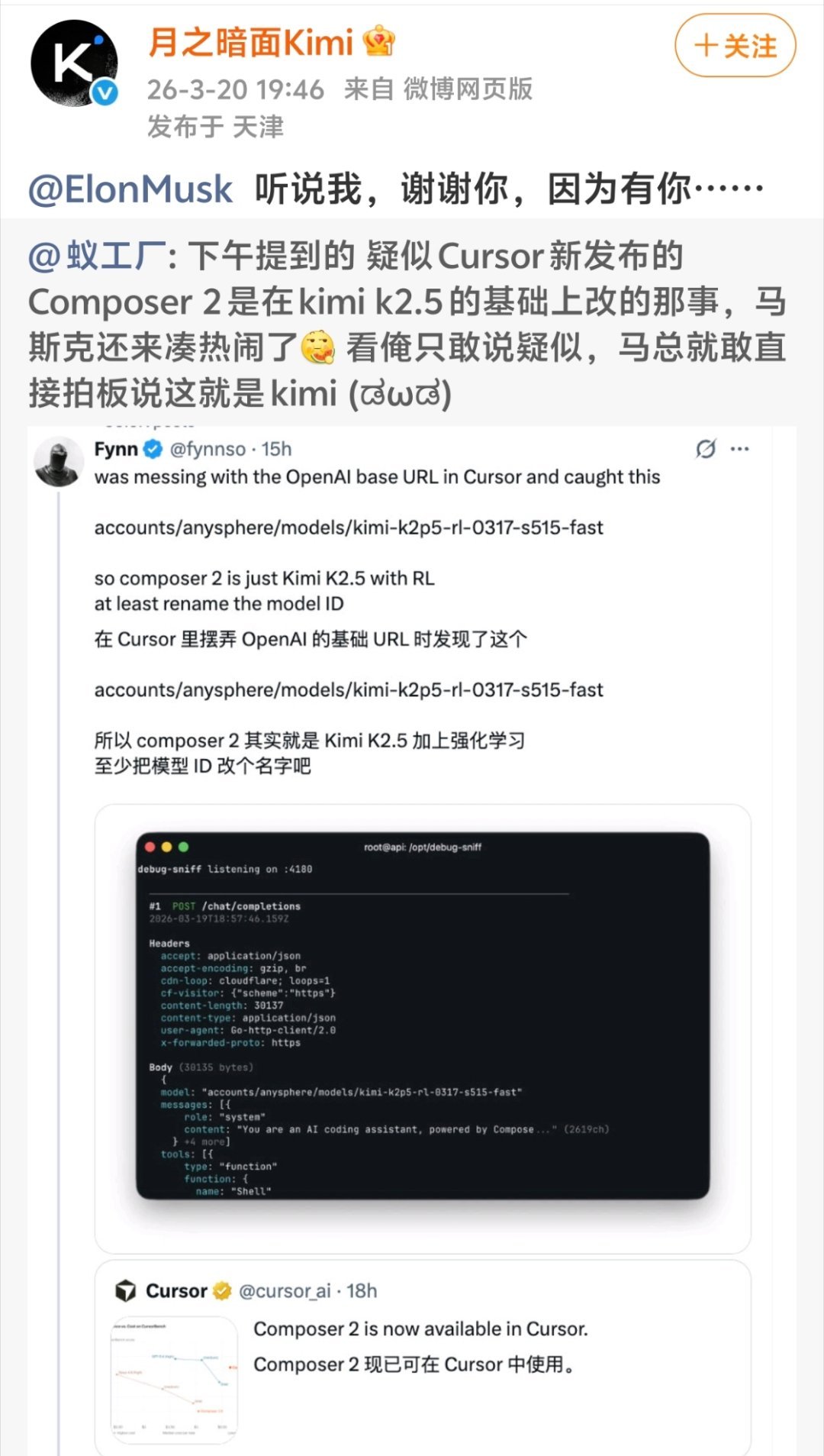 #马斯克为Kimi撑腰##中国AI格局一下子就打开了#这波中国AI属实是在全球刷足了存在感!海外爆火的AI编程工具Cursor,刚发布号称自研的Composer 2编程模型,转头就被开发者扒出底层用的是Kimi K2.5,连模型ID都没改干净。就在“套壳”争议发酵时,马斯克直接下场实锤:“是的,这就是Kimi 2.5”,哈哈哈哈哈。面对这场意外出圈,Kimi的回应格局拉满:大方祝贺Cursor团队,确认是合规商业合作,还玩梗感谢马斯克的“撑腰”。不知不觉,中国大模型已经成了海外热门AI工具的核心基座,还能得到马斯克的公开认可,这波中国AI的硬实力,真的藏不住了!