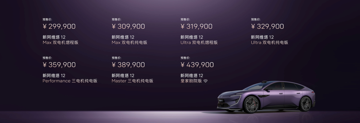 新版阿维塔12开启预售, 预售价29.99万元—43.99万元,有纯电和增程两个动力形式、7个车型可供选择。