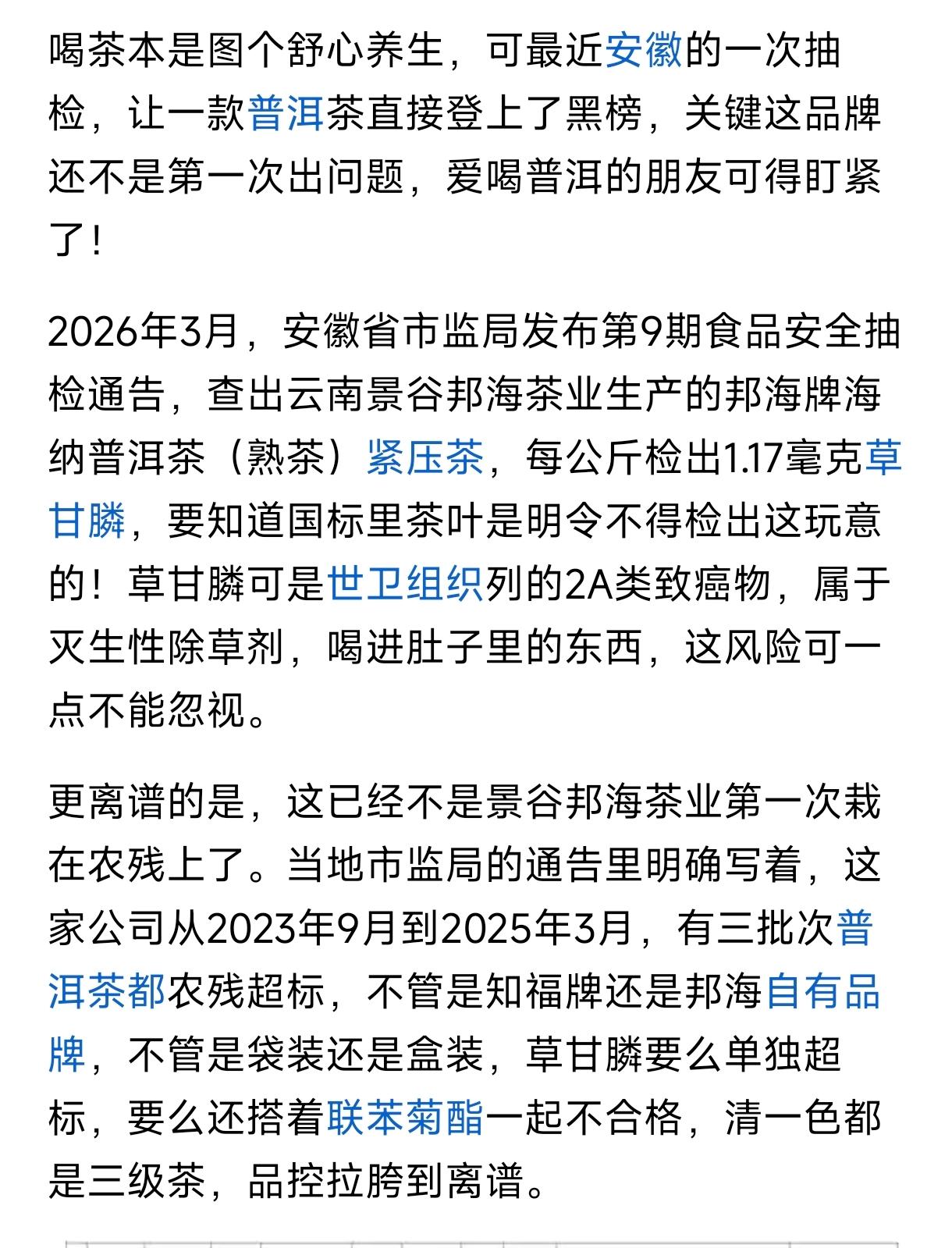 这片茶是不是发霉了? 最近听说有款普洱茶查出了农残超标, 每公斤检测出1.17毫克草甘膦, 草甘膦是2A类致癌物, 属于灭生性除草剂。 所以最近喝茶比较小心, 这片茶看上去像是白霜, 听说老茶会出现白霜不影响品饮, 但还是有点担心。