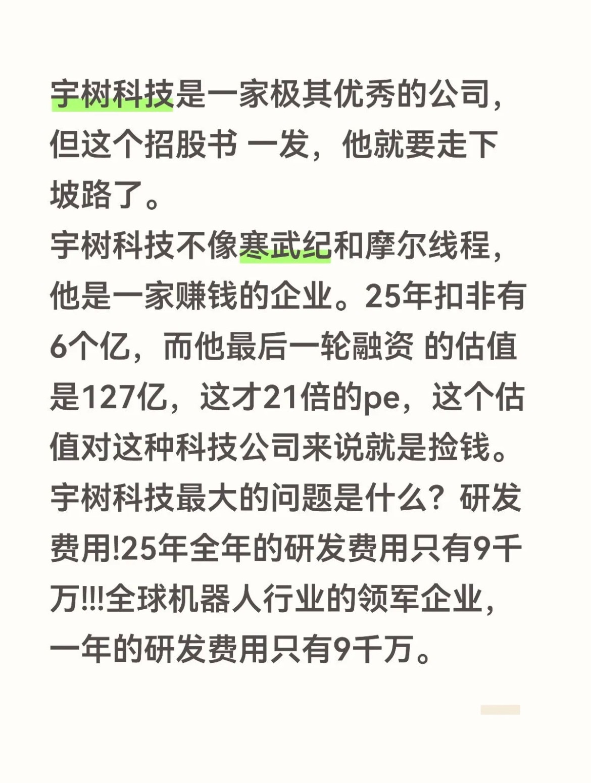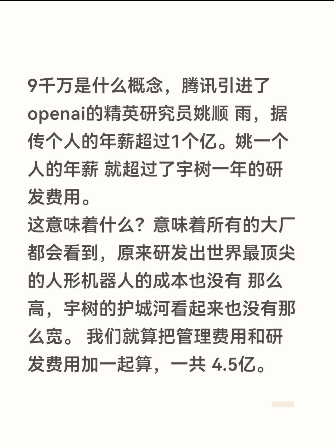 宇树科技最大的问题是什么?研发费用!25年全年的研发费用只有9千万!!!全球机器人行业的领军企业,一年的研发费用只有9千万。9千万是什么概念,腾讯引进了 openai的精英研究员姚顺雨,据传个人的年薪超过1个亿。姚一个人的年薪 就超过了宇树一年的研发费用。