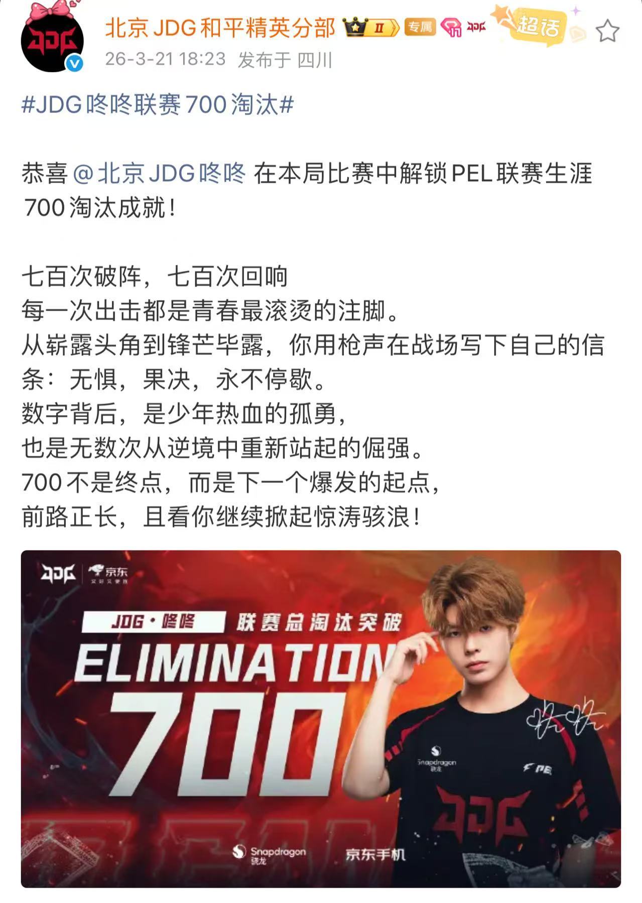 JDG咚咚联赛700淘汰 恭喜咚咚解锁700淘汰成就!手感火热运营拉满,期待后续再创佳绩