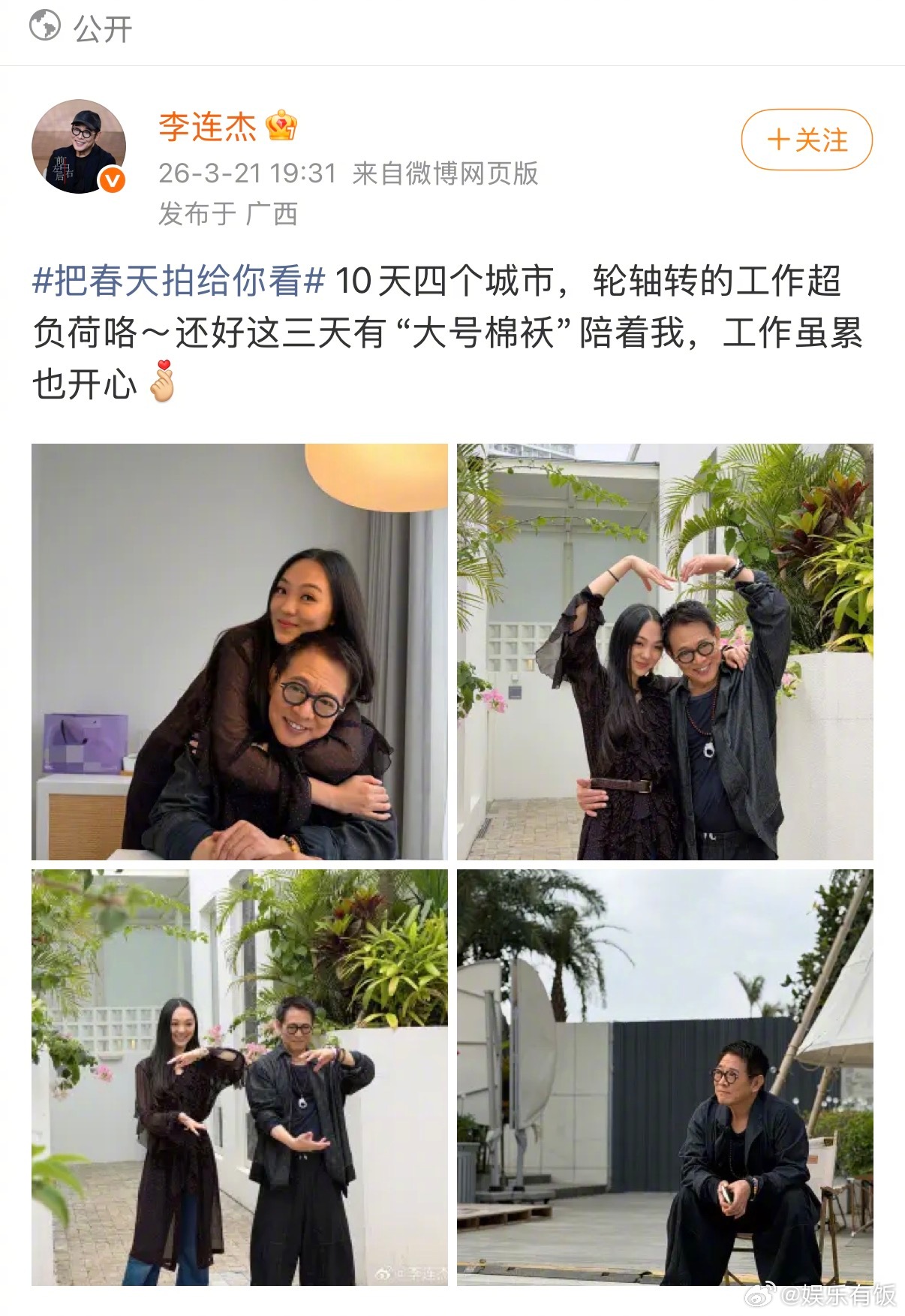 李连杰晒与大女儿合照晒出与大女儿的合照,表示有女儿陪伴工作虽累也开心,亲昵称呼