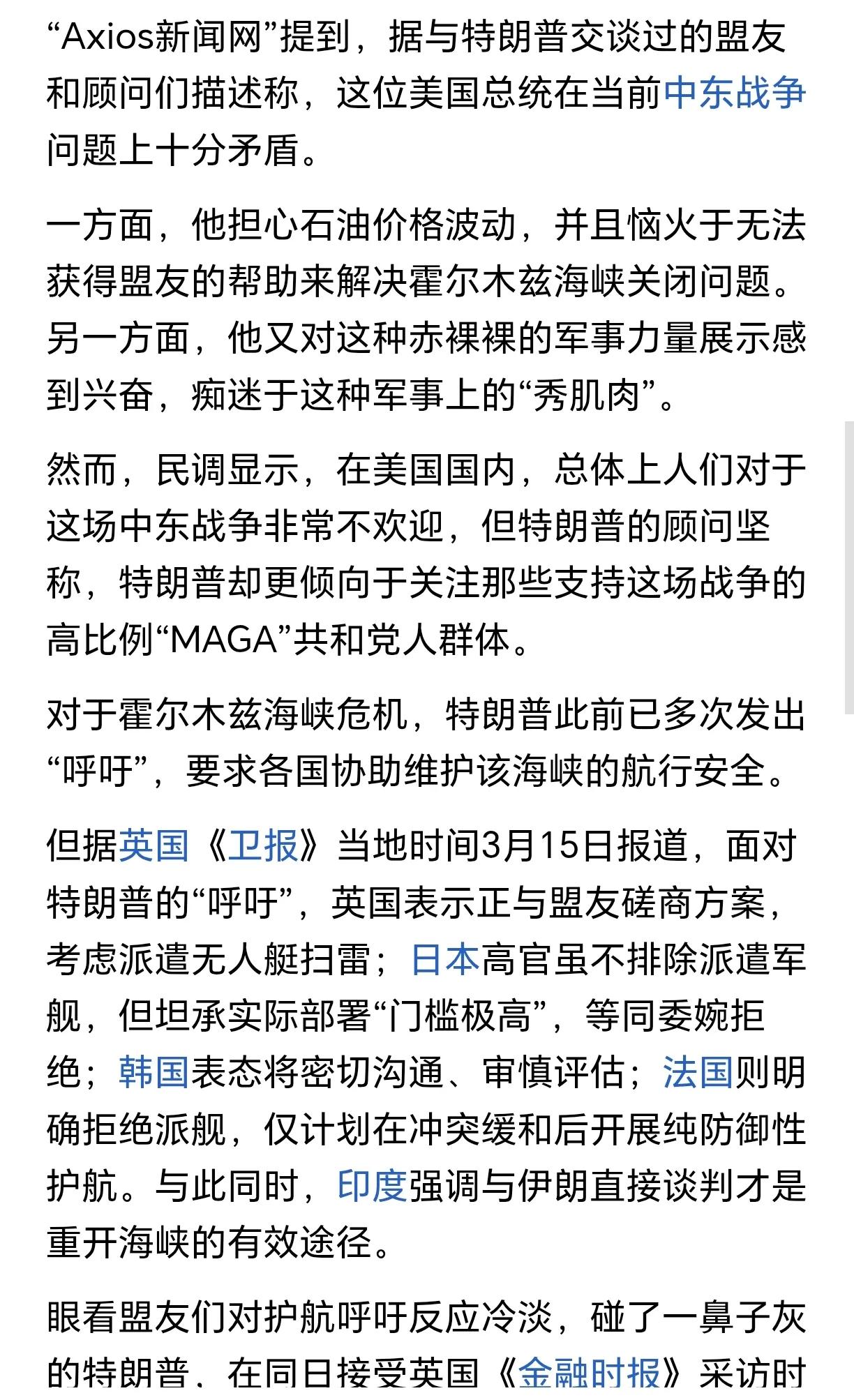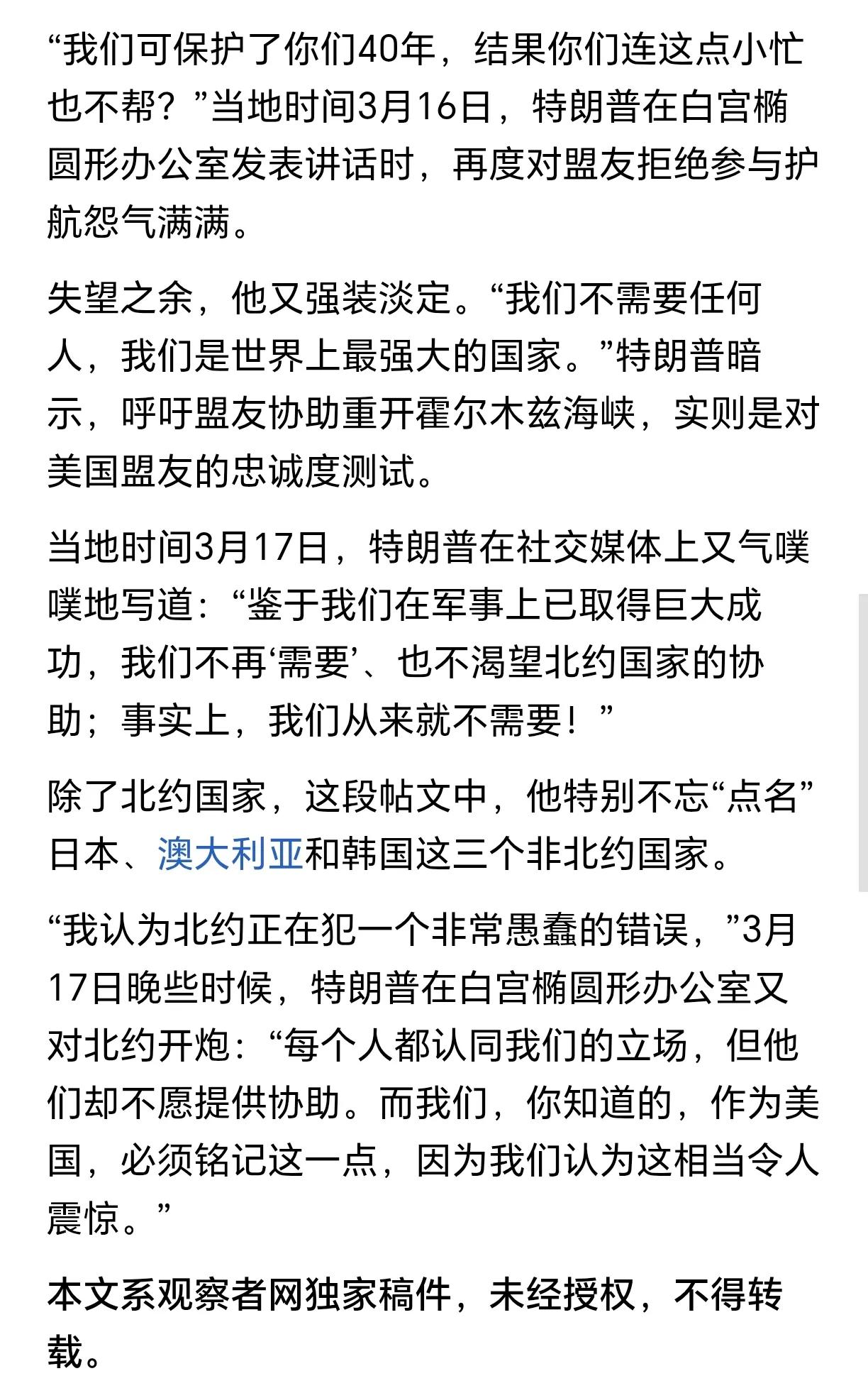 特朗普对北约的态度说明了当下美国色厉内荏的本质。 特朗普明显是希望北约成员国这群小弟们能够站出来呼应美国在霍尔木兹海峡的军事行动,呼吁他们能派军舰帮帮场子,觉得是美国保护了他们那么多年、现在到他们为美国出力了。 但在被不止是北约国家,还包括澳大利亚、日、韩等小弟们拒绝后,他又显得很愤怒,失望之余为了挽回面子、维持自己世界霸主老大哥的尊严,只能硬着头皮挽尊说“我们不再需要、也不渴望北约国家的协助”。至于有力的报复措施,则是有心无力了。 时代变了,美国往日那种一呼百应、小弟跪舔的日子早已过去,曾经的各路小弟和盟友们忠诚不再、各怀鬼胎,只有特朗普还觉得现在的美国和过去一样强盛。 特朗普对北约的态度说明了什么欧洲对特朗普 特朗普碰壁