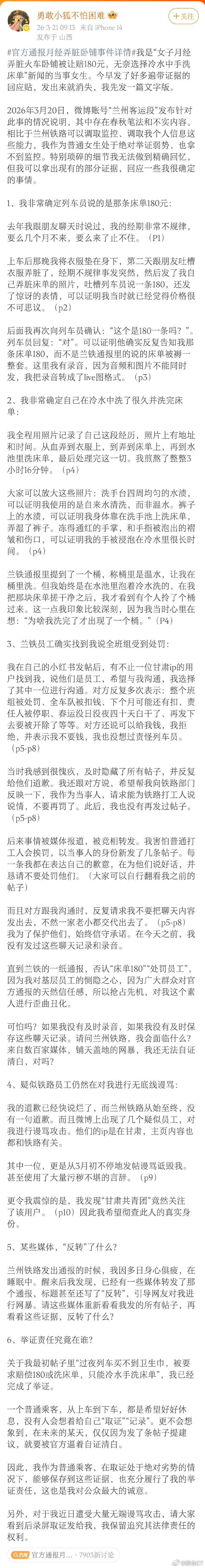 月经弄脏卧铺当事人详述事件经过 我话说得难听,我就直说了。近乎大半的女性议题,都