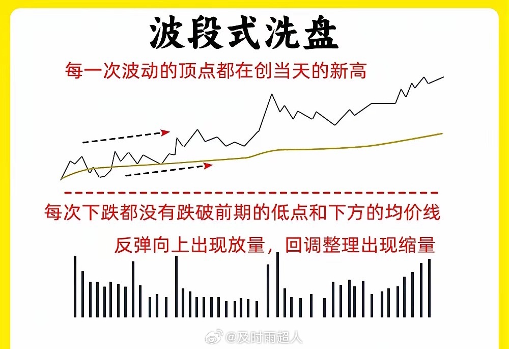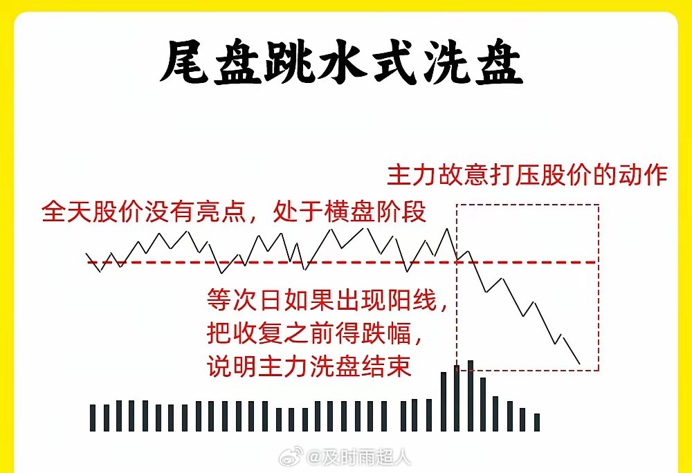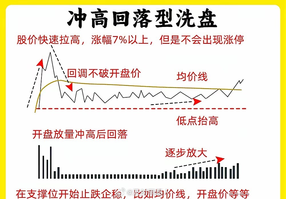 注意了!大部分散户在判断主力洗盘和出货,往往是大家最难分辨的。尤其是分时洗盘,分时图又是我们绕不开的试图。今天我就分享六种分时洗盘形态,建议认真看完还是老规矩,点赞收藏或评论六六六支持一下,我每天分享炒股干货,以免以后想温习找不到了一、冲高回落型洗盘在分时图里,股价在盘中出现大幅拉升,上涨幅度7%左右,主力故意不封板,随后股价开始回调。等到收盘的时候,一般是平盘、小涨收盘。这属于主力强势洗盘,我们需要注意两个细节,一个股价洗盘的位置,和股价冲高以后回调,成交量是否缩量二、上涨趋势强势洗盘在分时图里,股价处于上涨趋势里,突然股价开始大幅下跌,当时没有多少成交量,随后有开始止跌反弹向上,放出成交量,突破前期高点,这是主力边拉边洗的走势,我们需要注意,股价快速下跌成交量。整个分时图里,均价线一直处于向上三、波段式洗盘分时图里,股价先上涨,再下跌,再上涨,在下跌,整个过程里,股价低点在不断的抬高,整体的涨幅却不是很大。散户在里面就比较难受,这是主力用时间来换空间,清洗不坚定的筹码四、尾盘跳水式洗盘全天走势一般,处于一个横盘震荡的走势,等到尾盘突然大幅下跌,一般会超过3%但是呢,整个下跌过程里,成交量并没有放大,等到收盘就形成十字星或是长影线K线。五、炸板分时洗盘股价在分时图里,出现涨停,随后开始炸板回调,当时下跌的幅度不大,随后在封板,出现多次的炸板。所以就会导致换手率变大,这是主力手法,一般这种洗盘方法会在,一进二的阶段,已经出现首板涨停六、横盘震荡型洗盘全天窄幅震荡,织布机走势,这个盘面,看着很无趣。成交量出现缩量,主力已经锁仓,这种横盘缩量的走势很磨心态好了!以上就是分时图的六种洗盘形态。下方我准备了案例图,建议把案例牢记在心里。如果还有什么问题,可以留言告诉我。希望对大家有启发,也是最为基础的内容,一定吃透。