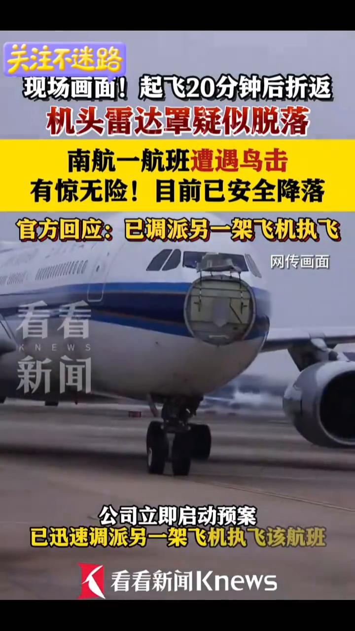 机头雷达罩疑似脱落,南航一航班遭遇鸟击,目前已安全降落。 看看新闻Knews。 现场画面,起飞20分钟后折返,机头雷达罩疑似脱落,南航一航班遭遇鸟击,有惊无险,目前已安全降落。官方回应:已调派另一架飞机执飞该航班。 3月21日中国南方航空发布情况说明:CZ3554航班(上海虹桥-深圳)今日中午起飞后遭遇鸟击,公司立即启动预案,已迅速调派另一架飞机执飞该航班。