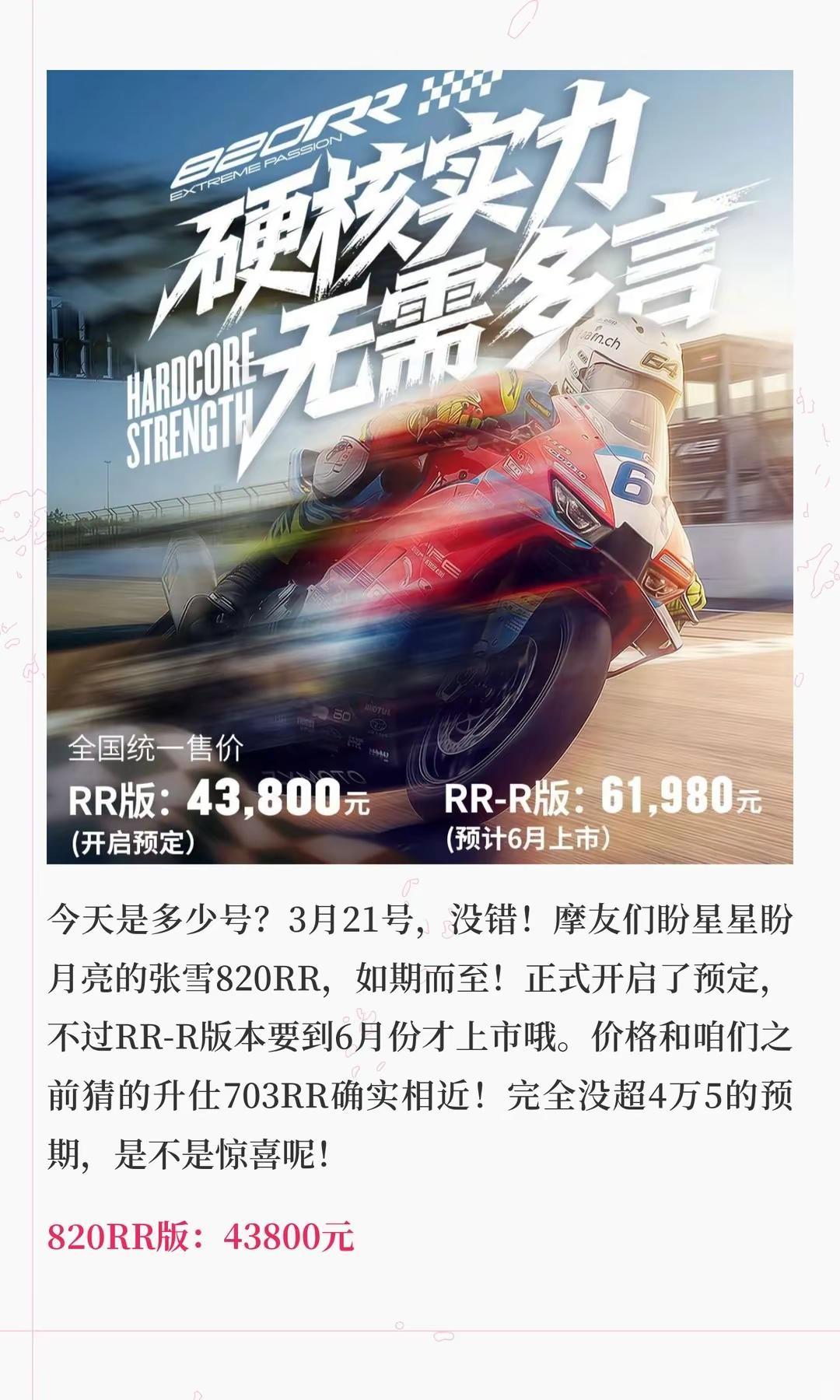 4.38万起,张雪820RR正式开起预定。驾龄不满一年禁买!4.38万起,张雪820RR正式开起预定!零百2.81秒+280极速张雪机车 张雪820rr 摩托车 新车上市