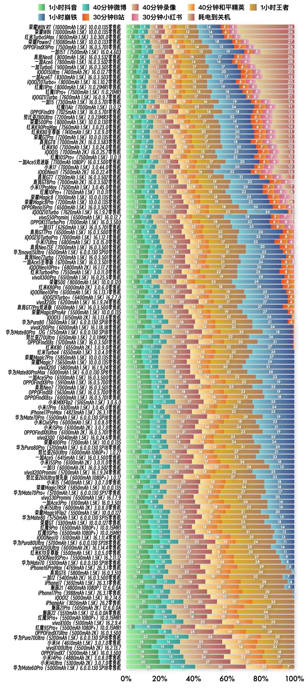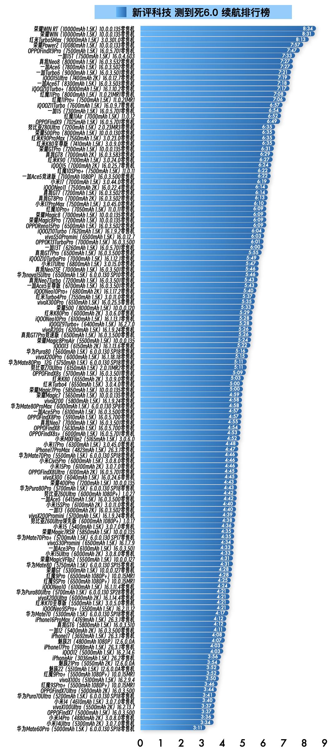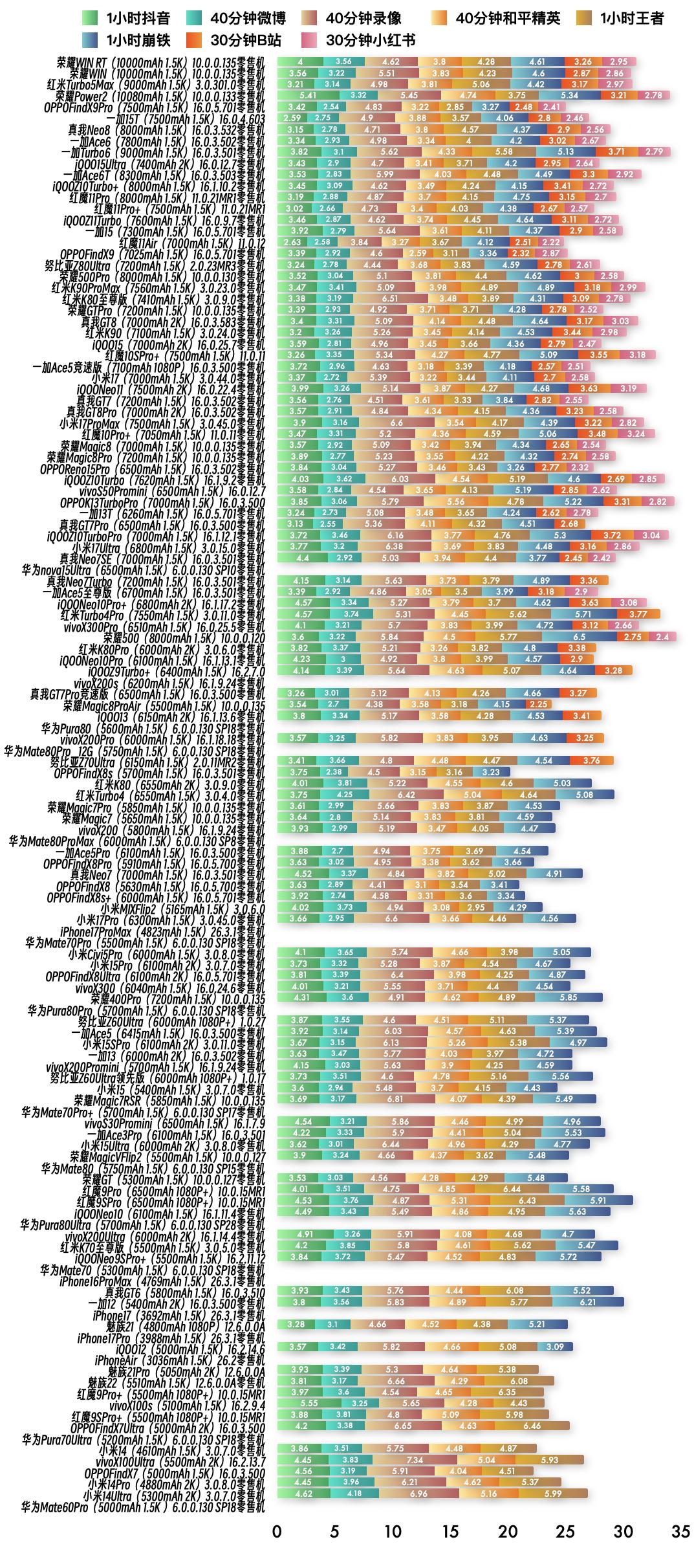 『3月21日最新手机续航榜单』 新评科技续航排行榜 6.0标准续航排行榜新增1台手机续航成绩,复测20台手机续航成绩⭐️完整详细榜单请访问新评科技数据库小程序⭐️ 『6.0标准续航榜单』新增 ① 一加15T 16.0.4.603版本总续航时间7小时33分钟,最新排名第6名 『6.0标准续航榜单』复测 ① 红米Turbo5Max零售机 第4次复测 3.0.301.0版本续航时间增加14分钟,总续航时间8小时13分钟,最新排名第3名【对比历史成绩续航不变】 ② 荣耀Power2零售机 第5次复测 10.0.0.133版本续航时间增加1分钟,总续航时间7小时57分钟,最新排名第4名【对比历史成绩续航不变】 ③ 一加13T零售机 第5次复测 16.0.5.701版本续航时间不变,总续航时间6小时整,最新排名第41名【对比历史成绩续航不变】 ④ 真我Neo7Turbo零售机 第4次复测 16.0.3.501版本续航续航时间增加7分钟,总续航时间5小时43分钟,最新排名并列第47名【对比历史成绩续航不变】 ⑤ iQOONeo10Pro+零售机 第4次复测 16.1.17.2版本续航时间不变,总续航时间5小时40分钟,最新排名第49名【对比历史成绩续航不变】 ⑥ vivoX300Pro零售机 第5次复测 16.0.25.5版本续航时间缩短4分钟,总续航时间5小时35分钟,最新排名第51名【对比历史成绩续航缩短】 ⑦ 红米K80Pro零售机 第5次复测 3.0.6.0版本续航时间增加30分钟,总续航时间5小时29分钟,最新排名第53名【对比历史成绩续航增加】 ⑧ iQOONeo10Pro零售机 第4次复测 16.1.13.1版本续航时间增加11分钟,总续航时间5小时28分钟,最新排名并列第54名【对比历史成绩续航缩短】 ⑨ vivoX200s零售机 第4次复测 16.1.9.24版本续航时间缩短2分钟,总续航时间5小时26分钟,最新排名并列第56名【对比历史成绩续航不变】 ⑩ 荣耀Magic8ProAir 第4次复测 10.0.0.135版本续航时间增加5分钟,总续航时间5小时24分钟,最新排名第58名【对比历史成绩续航不变】 11 华为Pura80零售机 第4次复测 6.0.0.130 SP18版本续航时间增加17分钟,总续航时间5小时16分钟,最新排名第60名【对比历史成绩续航增加】 12 华为Mate80Pro_12G零售机 第4次复测 6.0.0.130 SP18版本续航时间增加14分钟,总续航时间5小时11分钟,最新排名并列第62名【对比历史成绩续航缩短】 13 红米K80零售机 第4次复测 3.0.9.0版本续航时间增加6分钟,总续航时间5小时03分钟,最新排名第65名【对比历史成绩续航不变】 14 红米Turbo4零售机 第4次复测 3.0.4.0版本续航时间不变,总续航时间5小时整,最新排名并列第66名【对比历史成绩续航不变】 15 vivoX200零售机 第4次复测 16.1.9.24版本续航时间缩短22分钟,总续航时间4小时58分钟,最新排名并列第69名【对比历史成绩续航缩短】 16 一加Ace5Pro零售机 第3次复测 16.0.3.500版本续航时间缩短33分钟,总续航时间4小时57分钟,最新排名并列第71名【对比历史成绩续航缩短】 17 OPPOFindX8Pro零售机 第3次复测 16.0.5.700版本续航时间缩短1分钟,总续航时间4小时57分钟,最新排名并列第71名【对比历史成绩续航不变】 18 OPPOFindX8零售机 第4次复测 16.0.5.700版本续航时间缩短20分钟,总续航时间4小时54分钟,最新排名第74名【对比历史成绩续航不变】 19 小米MIXFlip2 第3次复测 3.0.6.0版本续航时间缩短9分钟,总续航时间4小时52分钟,最新排名第76名【对比历史成绩续航不变】 20 OPPOFindX8Ultra零售机 第5次复测 16.0.5.701版本续航时间不变,总续航时间4小时45分钟,最新排名并列第82名【对比历史成绩续航不变】 新评科技有6.0标准续航排行榜,6.0折叠屏续航排行榜,均可以查看每款手机每个环节功耗,5.1长续航版(低压力版)排行榜,所有排行榜共计208台手机中,有118台是零售机,从24年1月到26年3月,我们已经花费85.8万元人民币购买零售机。 新评科技续航排行榜,是全行业零售机最多、复测系统版本最新的续航排行榜,并且公布全程测试录像。