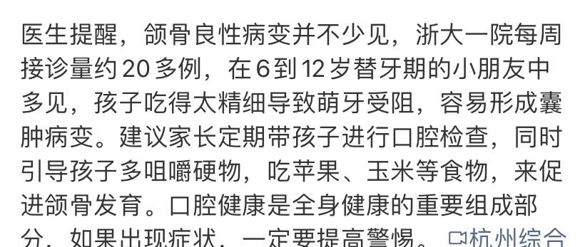 杭州一个11岁男孩脸肿、牙齿松动,家长一开始以为是牙齿发炎,让孩子认真刷牙,结果脸越来越不对称。去浙大一院一查,下颌骨中间已经断掉,确诊是颌骨良性肿瘤——囊性成釉细胞瘤。还好治疗及时,先开窗引流,再二次手术切除囊壁,2年随访骨头长得不错。 医生说,颌骨良性病变在6到12岁替牙期的小朋友中挺常见,浙大一院每周能接诊20多例。孩子吃得太精细,萌牙受阻就容易形成囊肿病变。家长一定要定期带孩子做口腔检查,让孩子多吃苹果、玉米这类硬物,促进颌骨发育,重视口腔健康。 这个案例给众多家长敲响了警钟。很多时候,孩子身体出现一些小状况,家长容易凭借经验简单判断,从而延误病情。就像这个11岁男孩的情况,脸肿、牙齿松动,在多数家长眼中可能就是普通的牙齿发炎,认真刷牙就能解决问题,却没想到背后隐藏着这么严重的疾病。 在日常生活里,现在的孩子饮食结构确实越来越精细。各种精细加工的食物,虽然口感好,但却不利于孩子颌骨的正常发育。像苹果、玉米这类硬物,孩子咀嚼起来需要花费更多力气,在这个过程中,颌骨能得到有效的锻炼,促进其正常生长。然而,很多家长担心孩子咀嚼困难或者怕孩子噎着,就很少让孩子吃这类食物。 定期的口腔检查也至关重要。它就像一个“健康小卫士”,能及时发现孩子口腔里潜在的问题,做到早发现、早治疗。家长们可不能因为怕麻烦或者觉得孩子小没必要,就忽视了这项重要的检查。毕竟,孩子的口腔健康关乎着他们的整体健康和成长。希望每一位家长都能重视起来,让孩子们拥有健康的口腔和灿烂的笑容。儿童蛀牙牙痛 牙肿半边脸 孩子眼睛长脓包 青少年蛀牙 牙齿松动的图片 儿童牙周炎 小学生牙齿受伤 唇颚裂儿童 十岁男孩肿瘤 脑瘤小男孩 小孩嘴巴长血泡 儿童脸部长包 颌骨骨瘤 小学生脸上长痘 宝宝下眼脸肿 儿童烂脸 来源:微博智搜