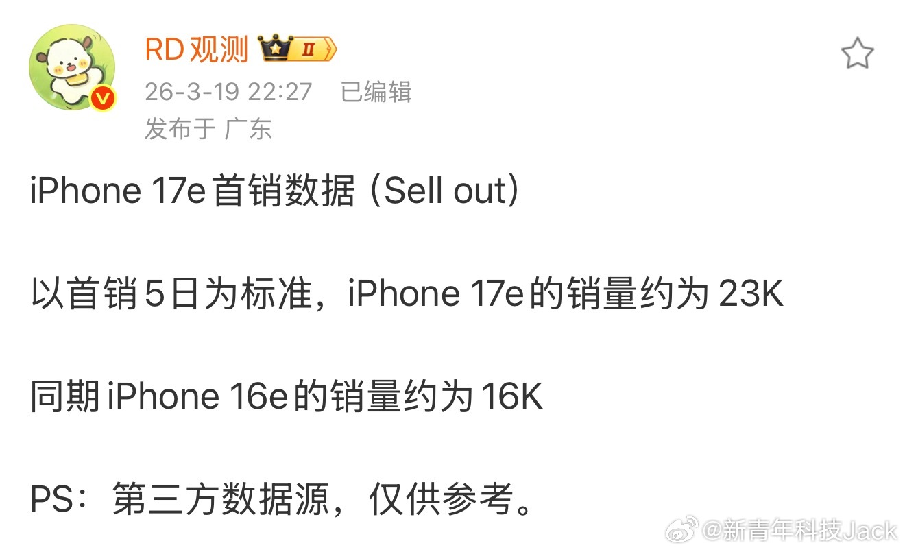 iPhone 17e开售5天销量约2.3万台,较前代iPhone 16e同期增长44%,虽然卖得相对上一代来说还可以。但苹果目前还是越贵的机器越好卖的趋势