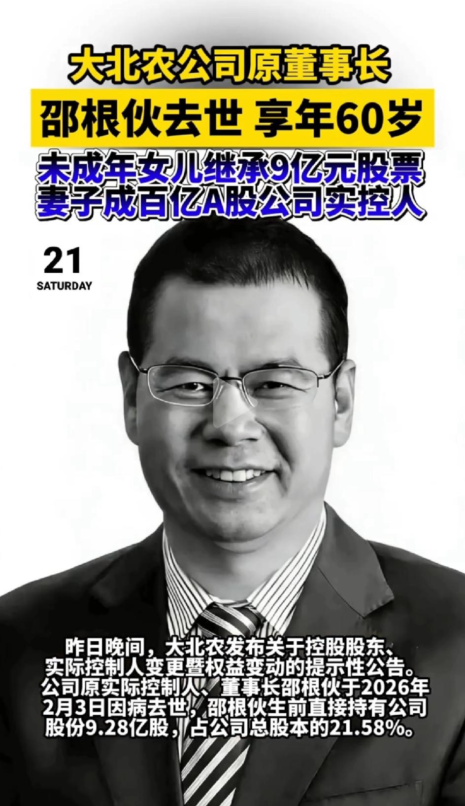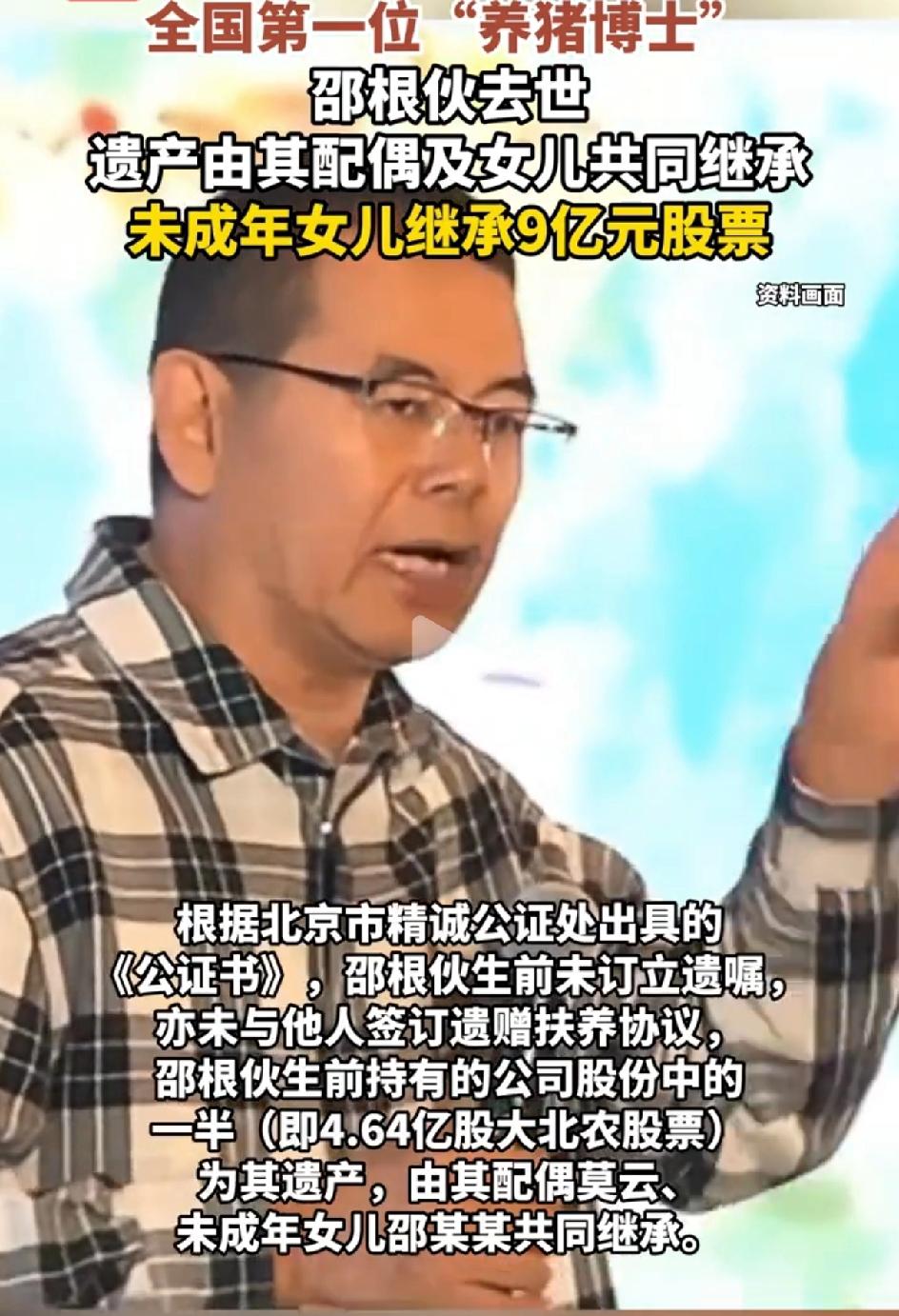 百亿A股实控人,邵根火去世,享年60。未成年的女儿继承九亿元股票。他生前还没有来得及立遗嘱。他是大北农公司原董事长。有9.28亿股大北农公司的股票。由妻子和女儿共同继承。女儿继承2.32亿股。妻子继承6.96亿。 钱财真的是生不带来,死不带去。