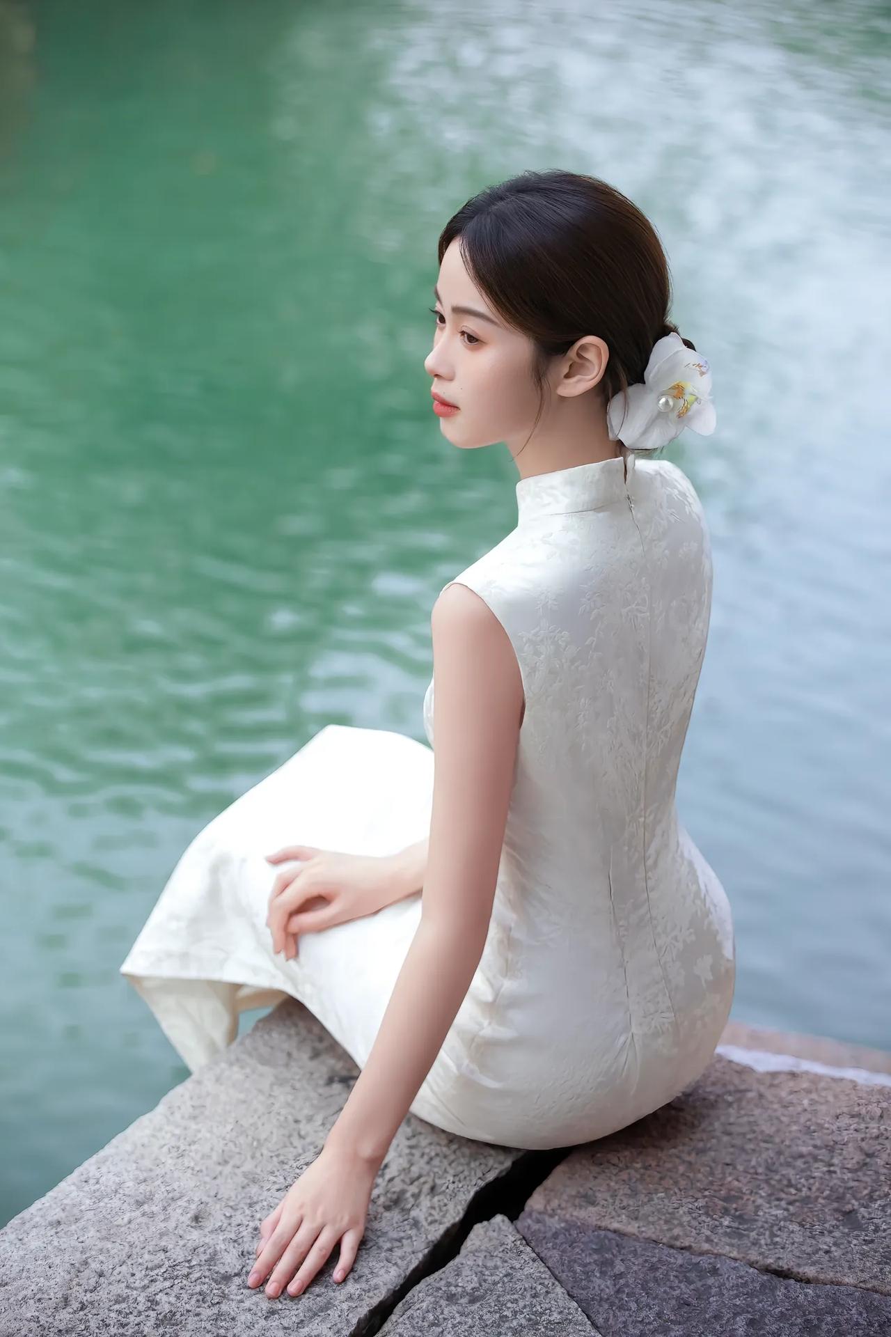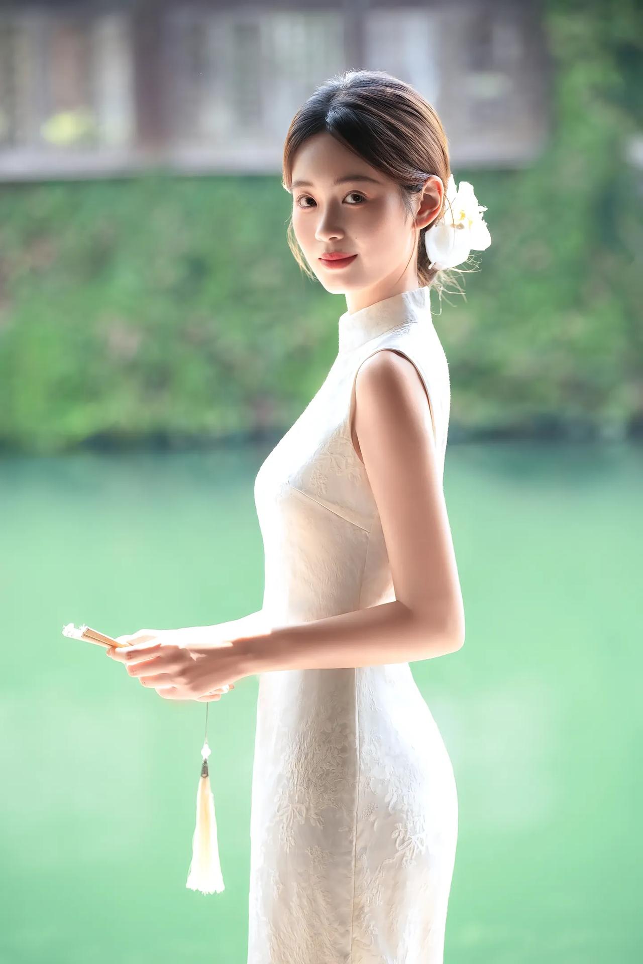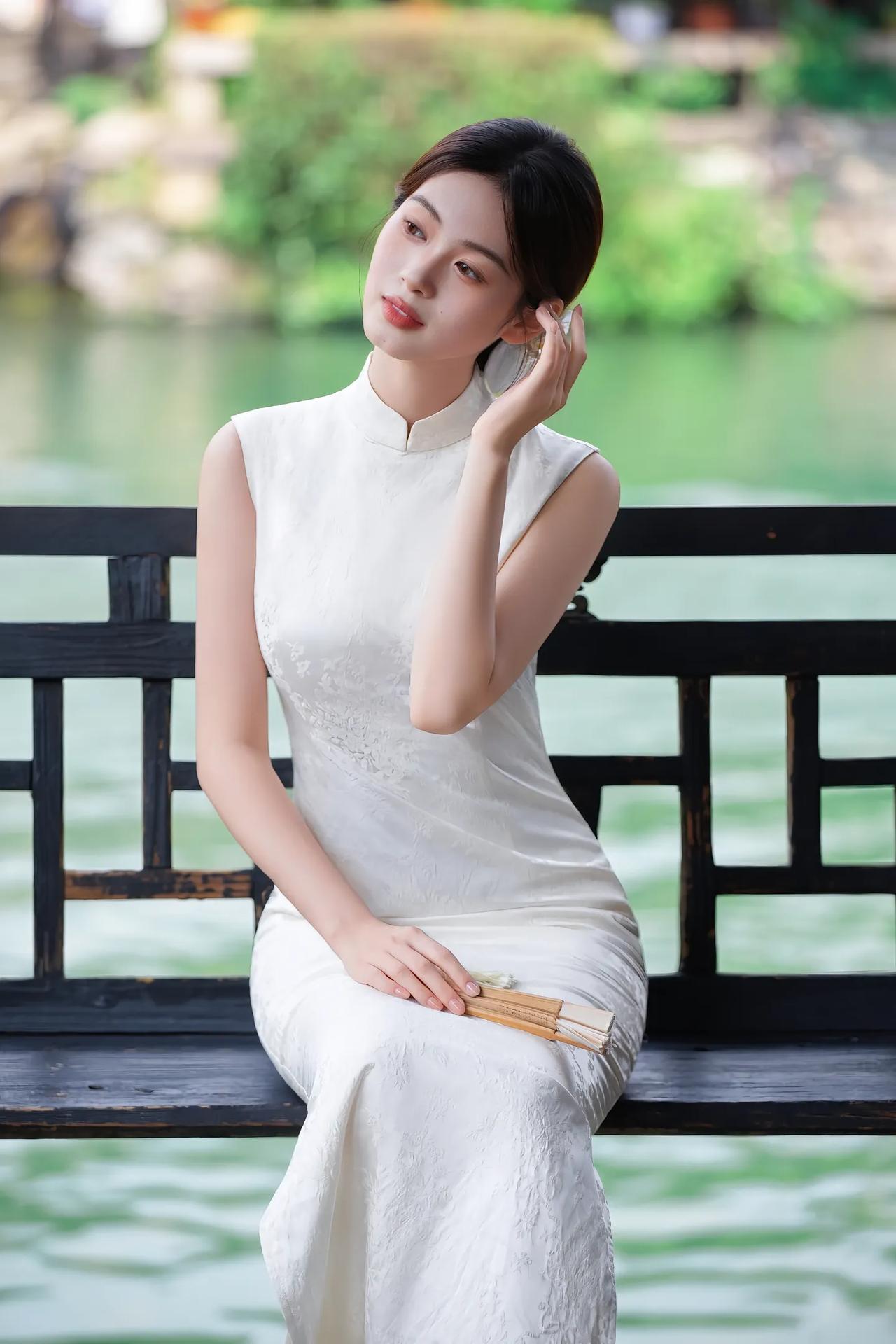温婉江南女,静坐水边长椅,手持折扇,悠然自得。