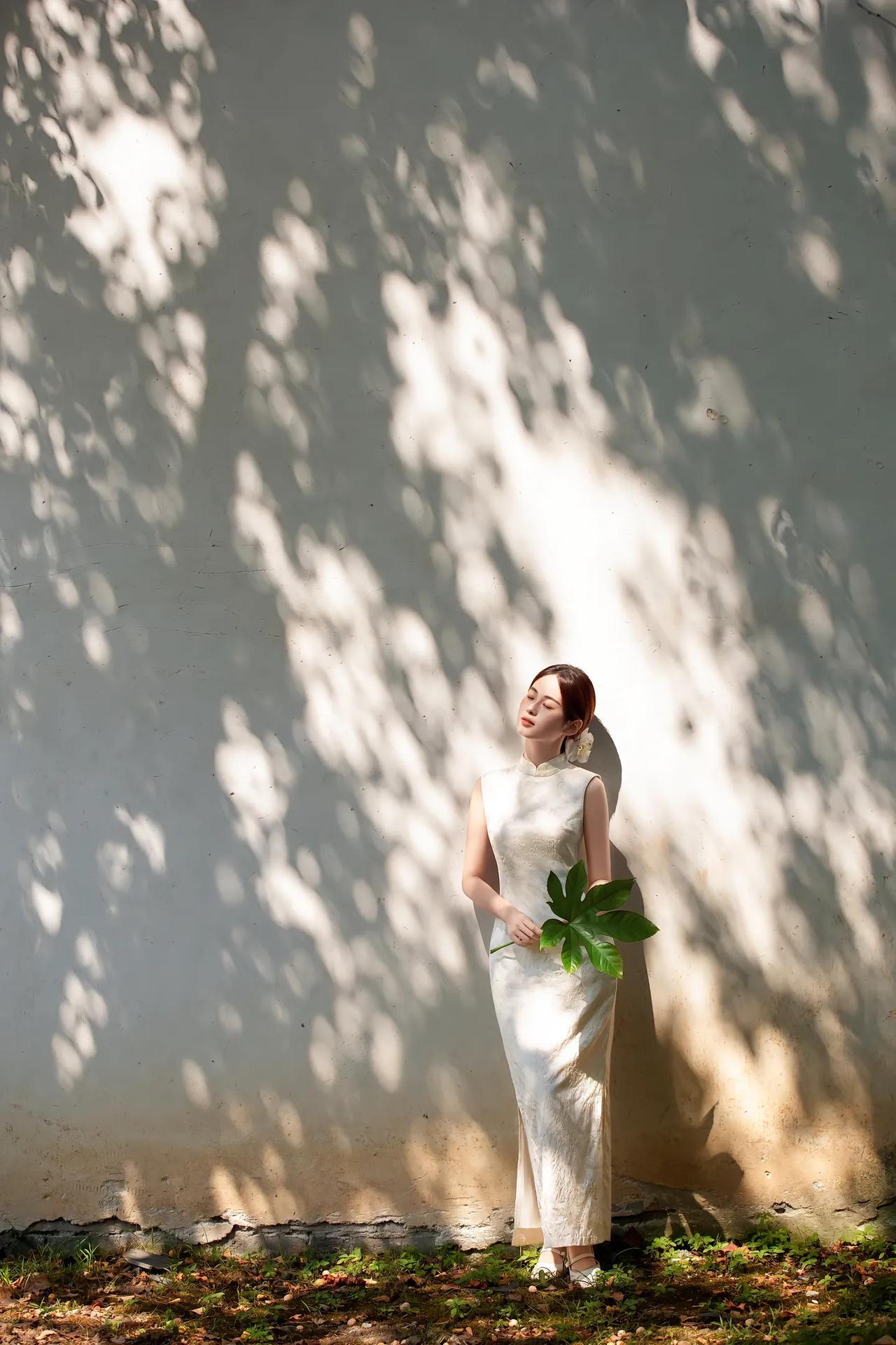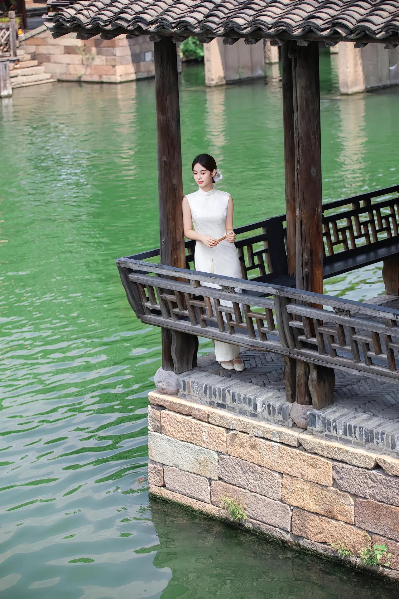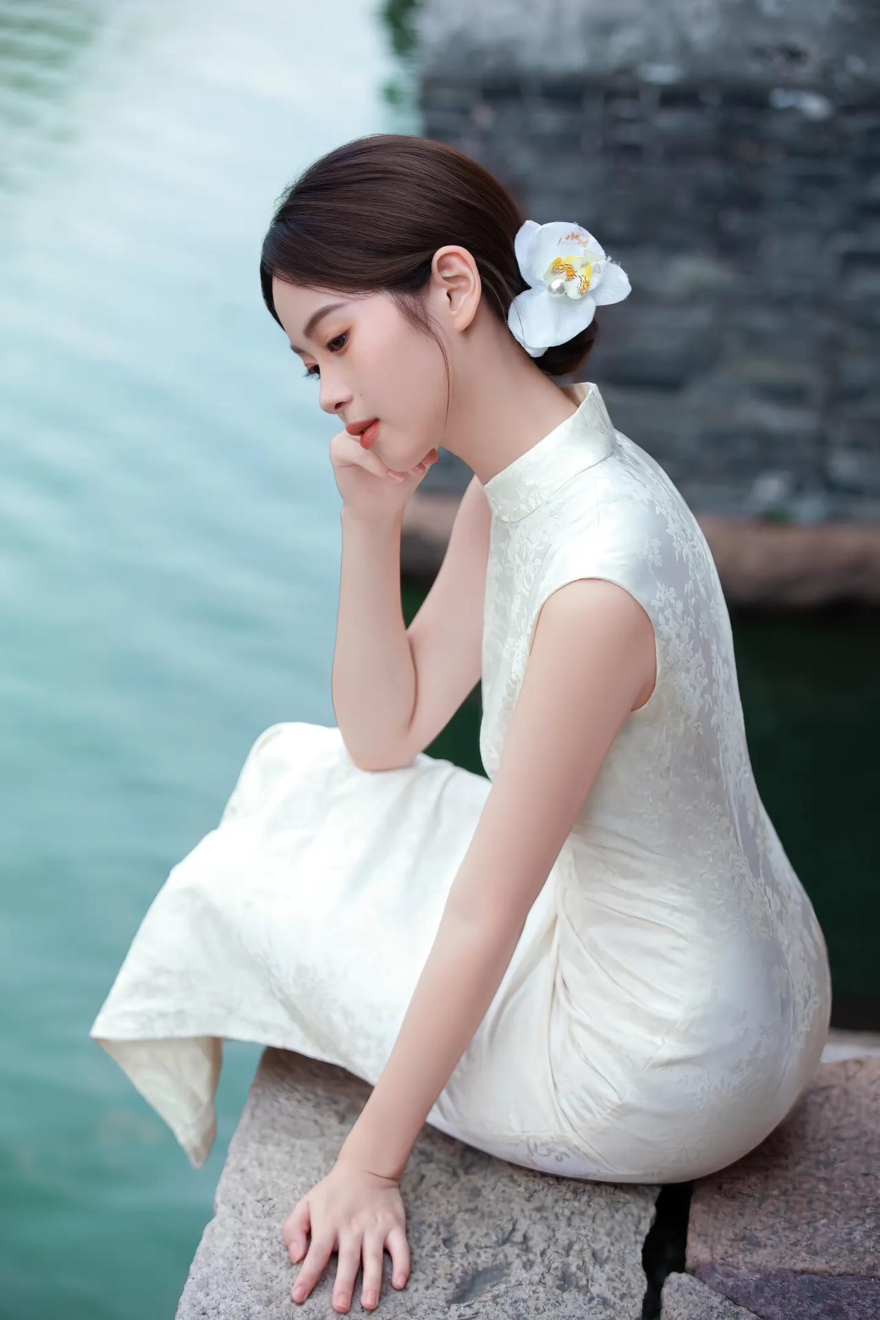 温婉江南女,静坐水边长椅,手持折扇,悠然自得。