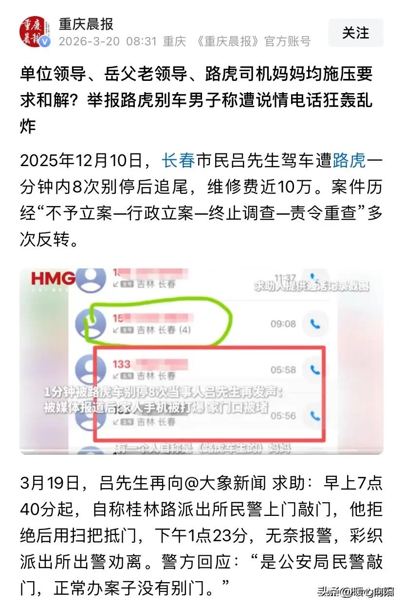 长春路虎车司机孙某某这下彻底慌了,现在找各种关系求和解,如果当初主动道歉并赔偿吕先生的损失,也不至于把事情闹大,现在可不是道歉赔偿那么简单了! 现在这件事在网络上持续发酵,路虎车司机的关系网也压不了,开始找各种关系相求和解,甚至找了吕先生的领导和岳父。可见对方的势力不一般来头不小呀! 之前以涉嫌危险驾车到以寻畔滋事再到无违法事实,最后终止案件调查。 3月19日,案件终于迎来了转机,长春警方通报,对路虎车别停司机孙某某己采取刑事强制措施,案件在进一步审理中! 行车记录仪记录的清清楚楚,53秒恶意別停8次造成追尾事故,这证据明明白白,想赖都赖不悼,现在不是道歉赔偿那么简单了? 孙某某怎么也没想到会走到这一步,现在彻底慌了,早知今日,何必当初呢?