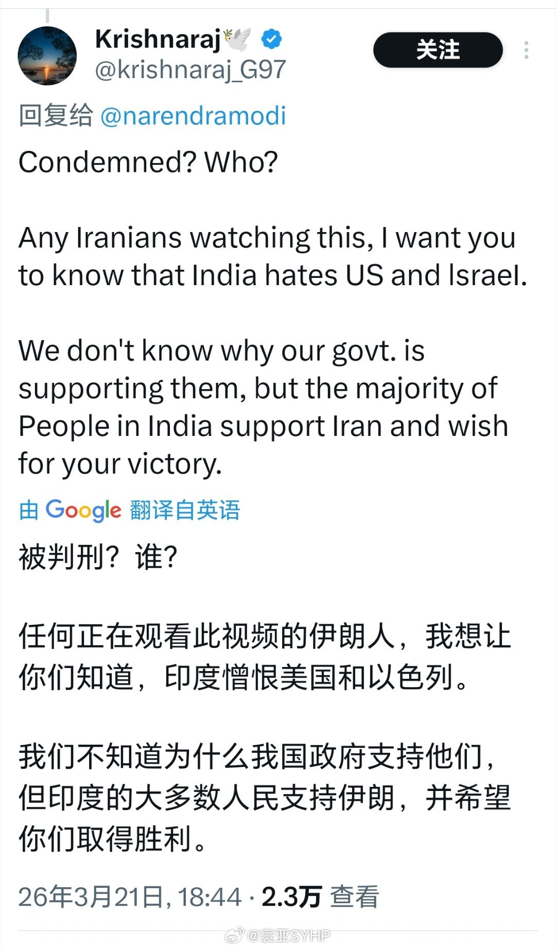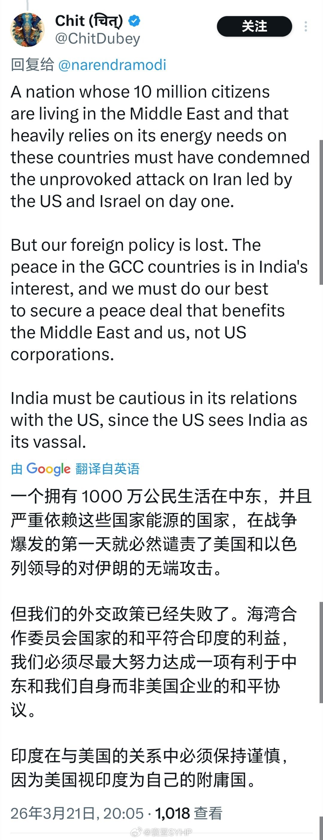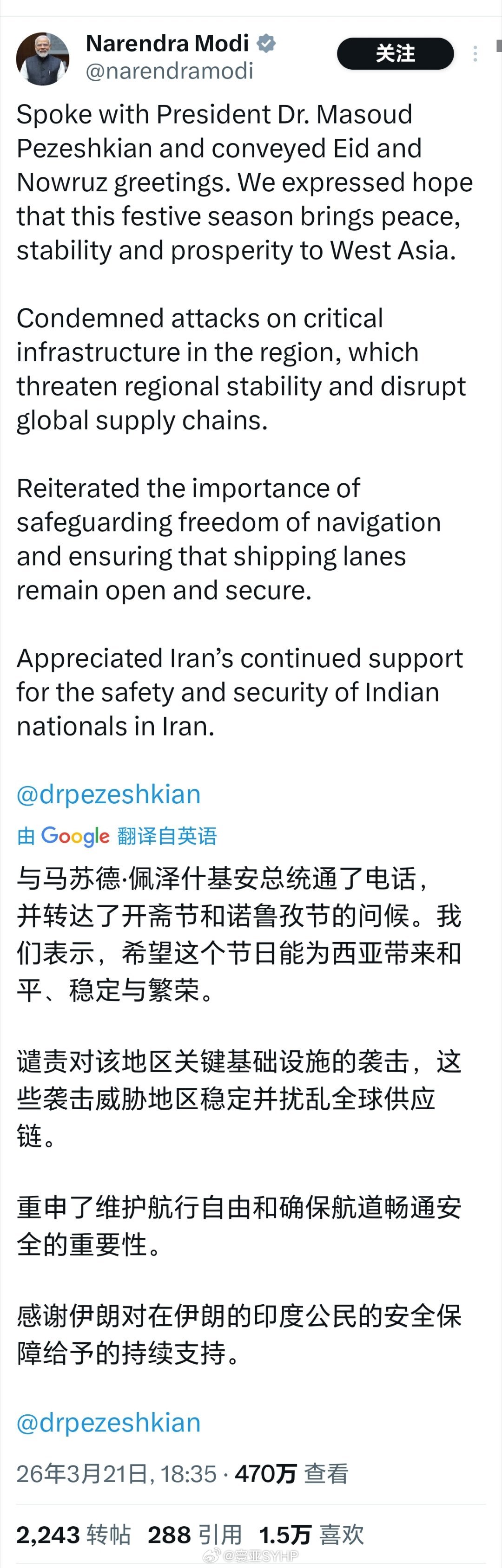 莫迪与伊朗总统通话印度总理莫迪发文称,再次与伊朗总统佩泽希齐扬通话。伊朗遭美国以色列袭击,莫迪一句话也不提。还是看评论才精彩。