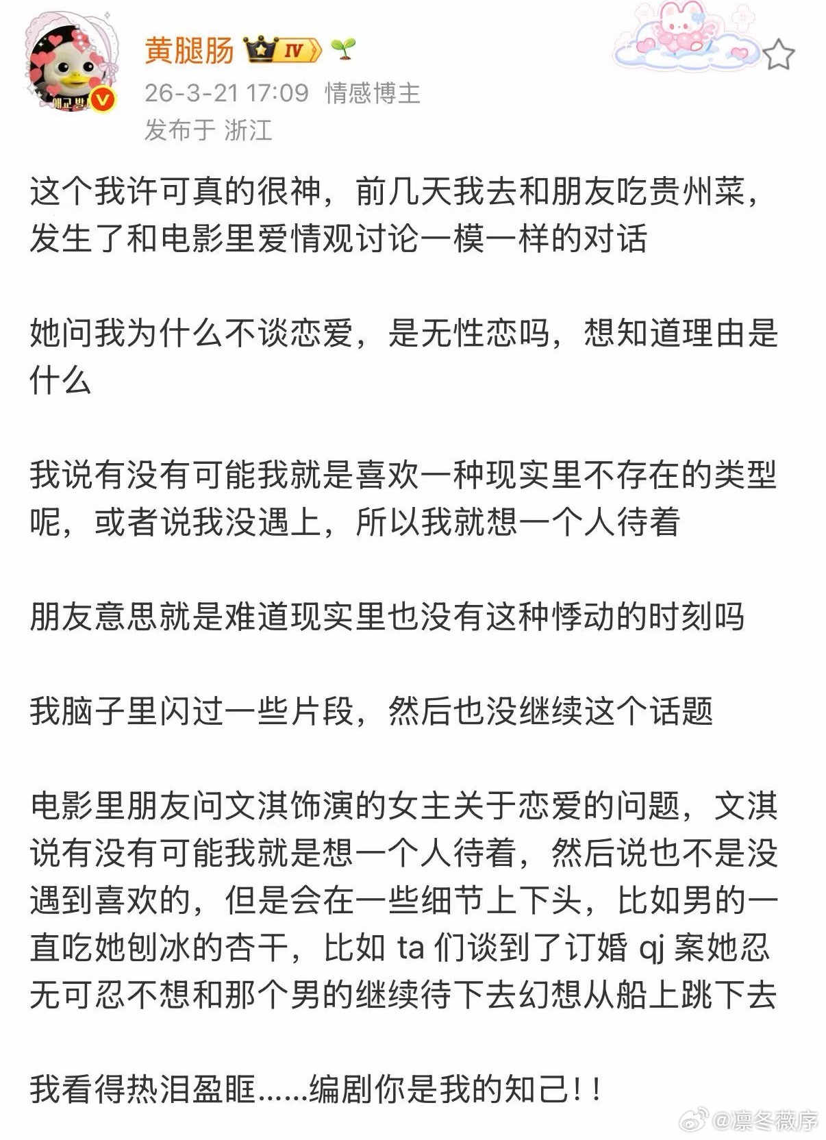文淇我许可点映口碑文淇新片点映口碑 看到《我,许可》的点映口碑,我的心已经飞过去了!预告里文淇的演技太绝了,把角色的情感演绎得淋漓尽致,repo说电影像一首温柔的歌,能抚平内心的焦虑和疲惫,23城点映已开,我要去听这首春日之歌!