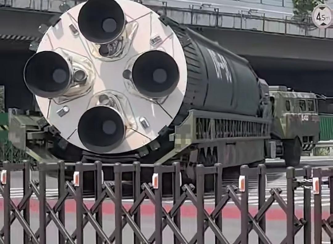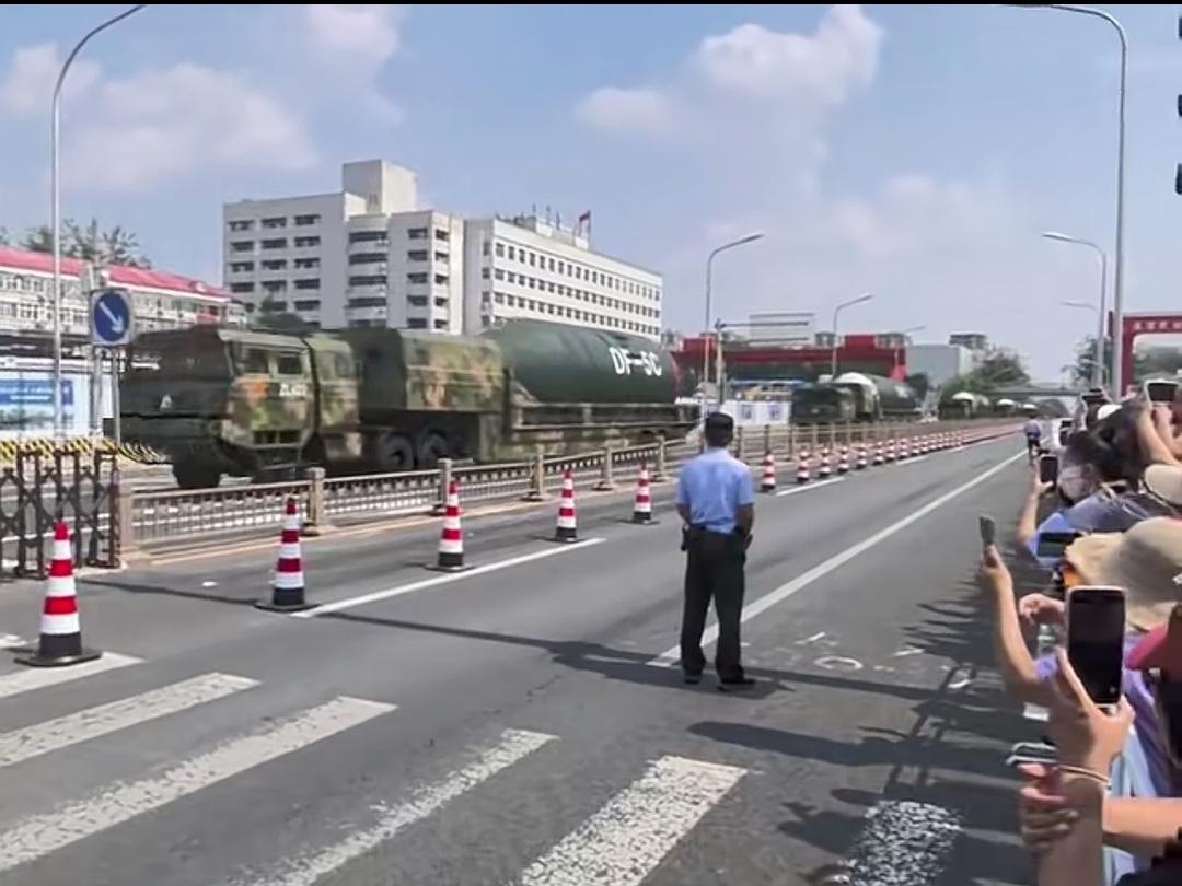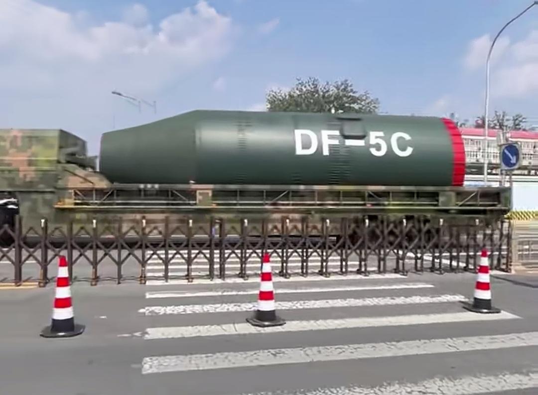 现在咱妈是越来越自信了! 东风5C这种镇国神器,是真的大呀! 阅兵我们只能远远看到它。 解说员介绍:覆盖全球! 这次能现场看到东风5C,真的太震撼了! 现场很多人举着手机拍照拍视频,边上有军迷解说: 这是弹头仓、这是一级箭体、这是二级箭体。 运载运载东风C的车,是军用重型特种运输车。 第一辆(四轴):搭载弹头舱(含分导式核弹头与制导系统)。 第二辆(五轴):搭载二级箭体(燃料舱+控制系统) 第三辆(六轴):搭载一级箭体/发动机段(主推进系统) 东风-5C是液体燃料洲际战略核导弹,弹长约32.6米、重近200吨,无法单车整体运输。