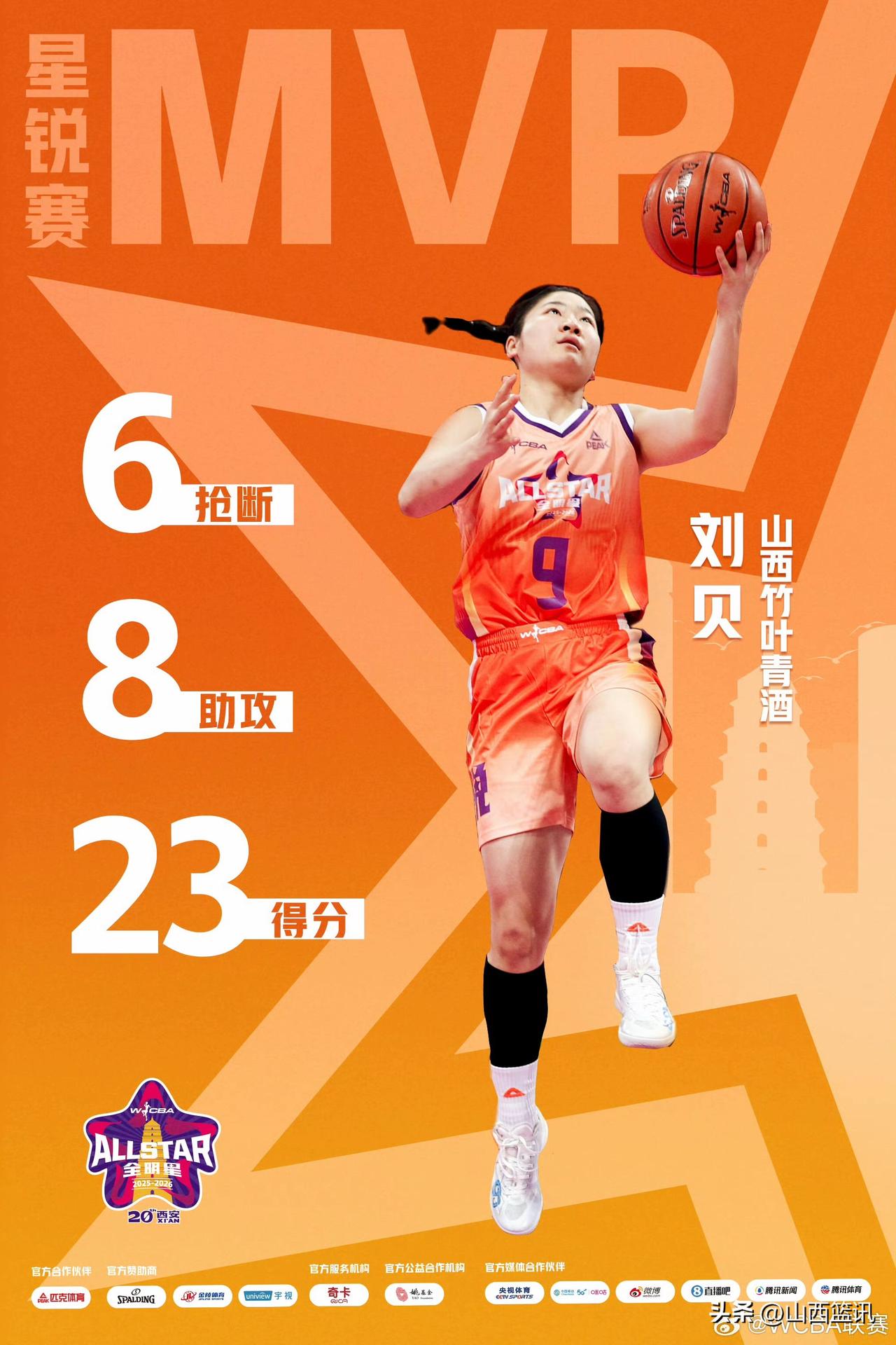 山西竹叶青酒女篮后卫队员刘贝今夜星光璀璨!在今天晚上进行了WCBA全明星周末星锐赛的比赛中,北区新锐队 99-70 战胜南区新锐队。其中,山西竹叶青酒女篮队员、WCBA联赛2026年俱乐部杯冠军队成员刘贝,荣获星锐赛MVP,成为耀眼的星星。刘贝砍下全场最高的23分,另外还拿下6篮板8助攻6抢断的全面数据,被评为新锐赛MVP当之无愧。 与此同时,今晚进行的三分球预赛、技巧大赛均名花有主、挺进决赛。唯独山西女篮没有选派球员参加该项赛事。