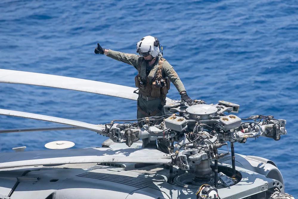 2026年3月19日,在美利坚级两栖攻击舰的的黎波里号(LHA 7)飞行甲板上检查一架隶属于海战直升机战斗中队(HSC)25的MH-60S海鹰直升机。的黎波里号目前正在美国第七舰队作战区执行常规任务。 美国第七舰队是美国海军最大的前沿部署编号舰队,定期与盟友和合作伙伴互动并协同作战。