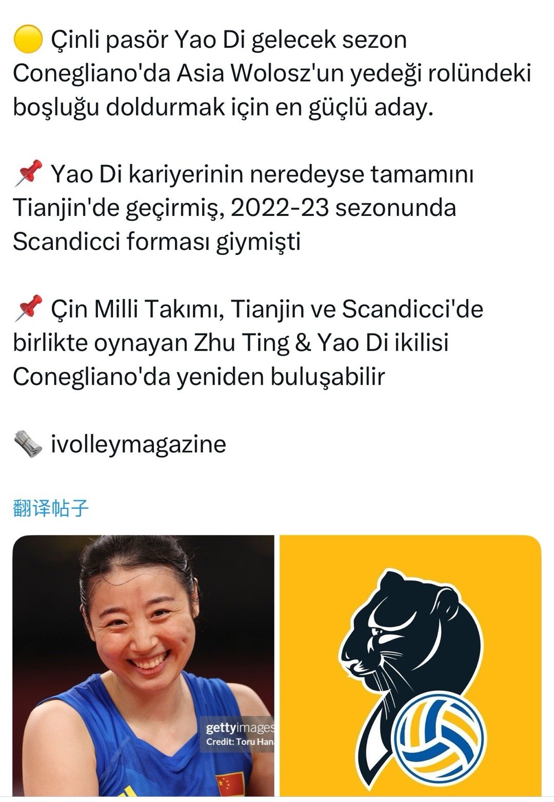 📌中国国家队,曾在天津和斯坎迪奇一起打球的朱婷和姚迪组合,可能会在科内利亚诺重聚。