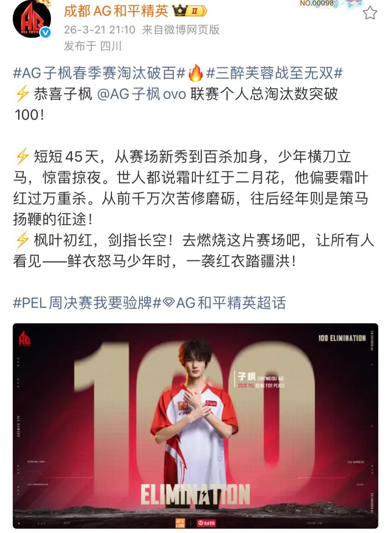 AG子枫春季赛淘汰破百领域春季赛淘汰破百 从赛场初见到百淘汰里程碑,子枫与领域稳
