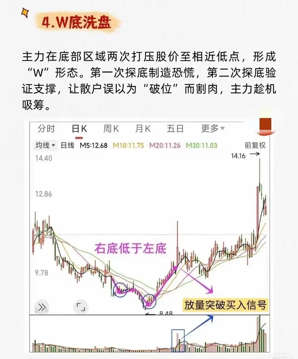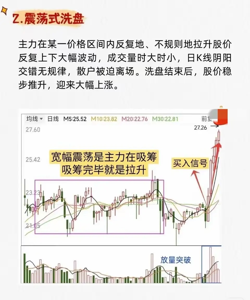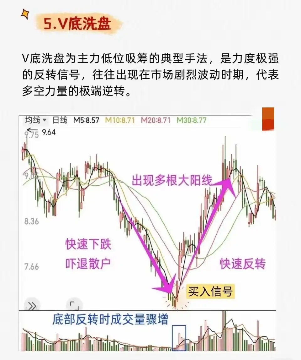 1. 平台式洗盘 * 特征:股价在底部长期横盘缩量,整理至跌无可跌后,突然出现一根大阳线放量突破平台。 * 含义:洗盘结束,开始飙升。2. 震荡式洗盘 * 特征:股价在一定区间内宽幅上下波动,成交量忽大忽小,K线阴阳交错。整理结束后放量突破。 * 含义:主力吸筹完毕,即将开启大幅上涨。3. 边拉边洗式洗盘 * 特征:整体趋势向上,但过程中穿插小幅回调。回调幅度不大,通常不跌破关键均线,之后快速收复失地。 * 含义:在拉升中清洗获利盘,吸引新资金,为后续拉升铺路。4. W底洗盘 * 特征:股价在底部形成“W”形态,右底低于左底。第二次探底后放量突破颈线。 * 含义:主力制造“破位”恐慌让散户割肉,完成最后吸筹后启动主升浪。5. V底洗盘 * 特征:股价快速下跌后迅速反转,形成V型底。底部反转时成交量骤然放大,并出现多根大阳线。 * 含义:市场剧烈波动后的极端反转信号,主升浪启动。6. 缩量突破式洗盘 * 特征:股价在下跌趋势末期缩量企稳,随后放量突破下跌趋势线或关键平台。 * 含义:缩量洗盘结束,真突破出现,是买入信号。7. 堆量拉涨式洗盘 * 特征:股价在上涨初期以小阴小阳方式温和放量(“堆量”),建立仓位;随后可能再次洗盘,最终巨量拉升。 * 含义:主力已进场,通过“涨中洗”清理浮动筹码,为后续大幅拉升减轻阻力。