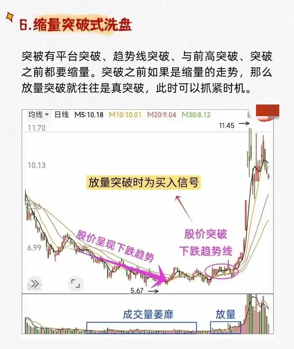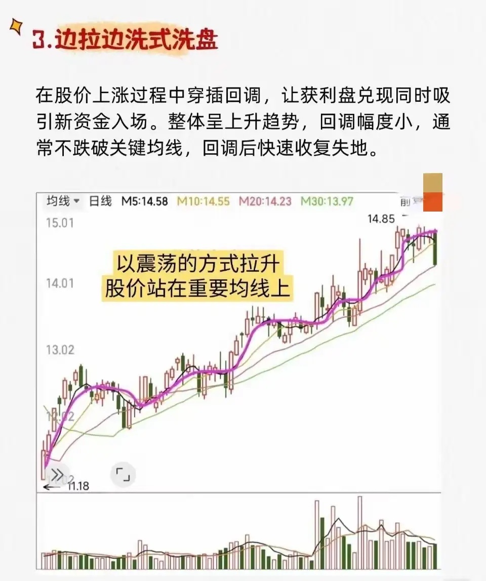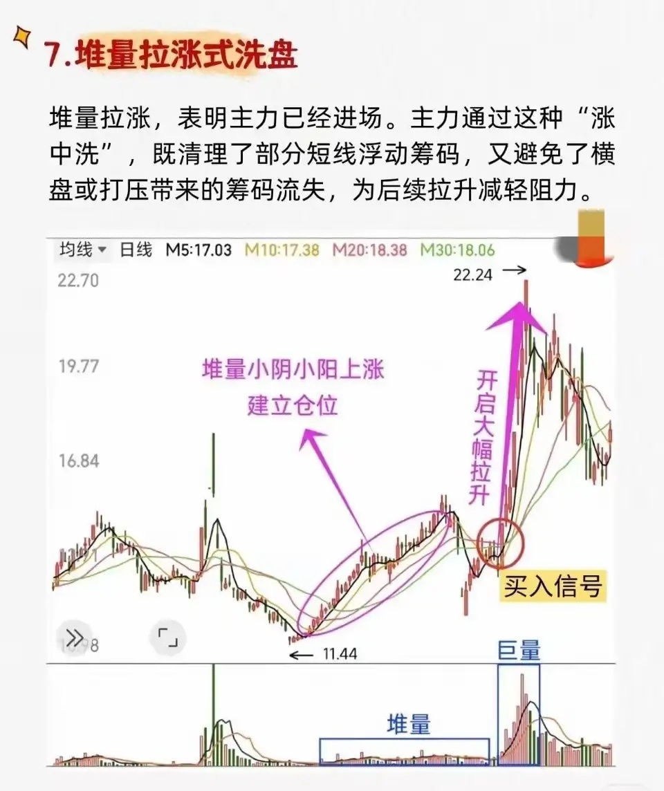 1. 平台式洗盘 * 特征:股价在底部长期横盘缩量,整理至跌无可跌后,突然出现一根大阳线放量突破平台。 * 含义:洗盘结束,开始飙升。2. 震荡式洗盘 * 特征:股价在一定区间内宽幅上下波动,成交量忽大忽小,K线阴阳交错。整理结束后放量突破。 * 含义:主力吸筹完毕,即将开启大幅上涨。3. 边拉边洗式洗盘 * 特征:整体趋势向上,但过程中穿插小幅回调。回调幅度不大,通常不跌破关键均线,之后快速收复失地。 * 含义:在拉升中清洗获利盘,吸引新资金,为后续拉升铺路。4. W底洗盘 * 特征:股价在底部形成“W”形态,右底低于左底。第二次探底后放量突破颈线。 * 含义:主力制造“破位”恐慌让散户割肉,完成最后吸筹后启动主升浪。5. V底洗盘 * 特征:股价快速下跌后迅速反转,形成V型底。底部反转时成交量骤然放大,并出现多根大阳线。 * 含义:市场剧烈波动后的极端反转信号,主升浪启动。6. 缩量突破式洗盘 * 特征:股价在下跌趋势末期缩量企稳,随后放量突破下跌趋势线或关键平台。 * 含义:缩量洗盘结束,真突破出现,是买入信号。7. 堆量拉涨式洗盘 * 特征:股价在上涨初期以小阴小阳方式温和放量(“堆量”),建立仓位;随后可能再次洗盘,最终巨量拉升。 * 含义:主力已进场,通过“涨中洗”清理浮动筹码,为后续大幅拉升减轻阻力。