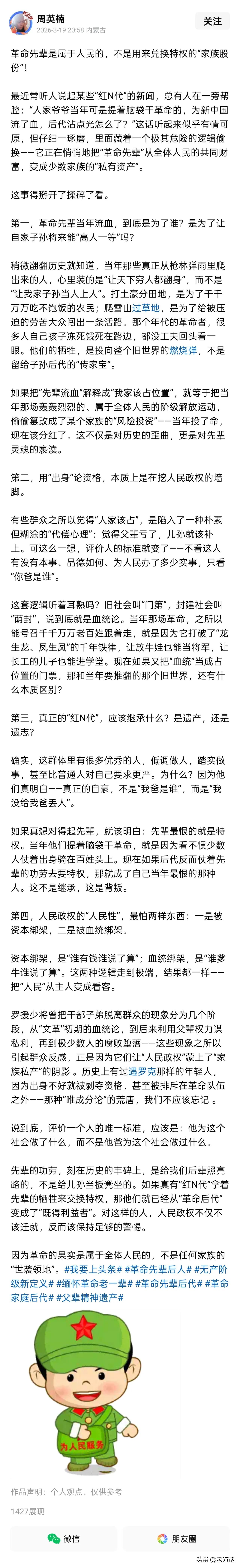 这篇文章写得非常的好,其实不论是红几代,我们都应该是站在先辈的肩上,不断的开创新的辉煌,而不是站在他们建功立业的基础上来享福的。作为先辈的后人,更应该继续创造价值,应该继承他们的遗志。这样才能对得起身上的血脉传承,这样才是真正的红几代。这样才是红后代的真正意义。