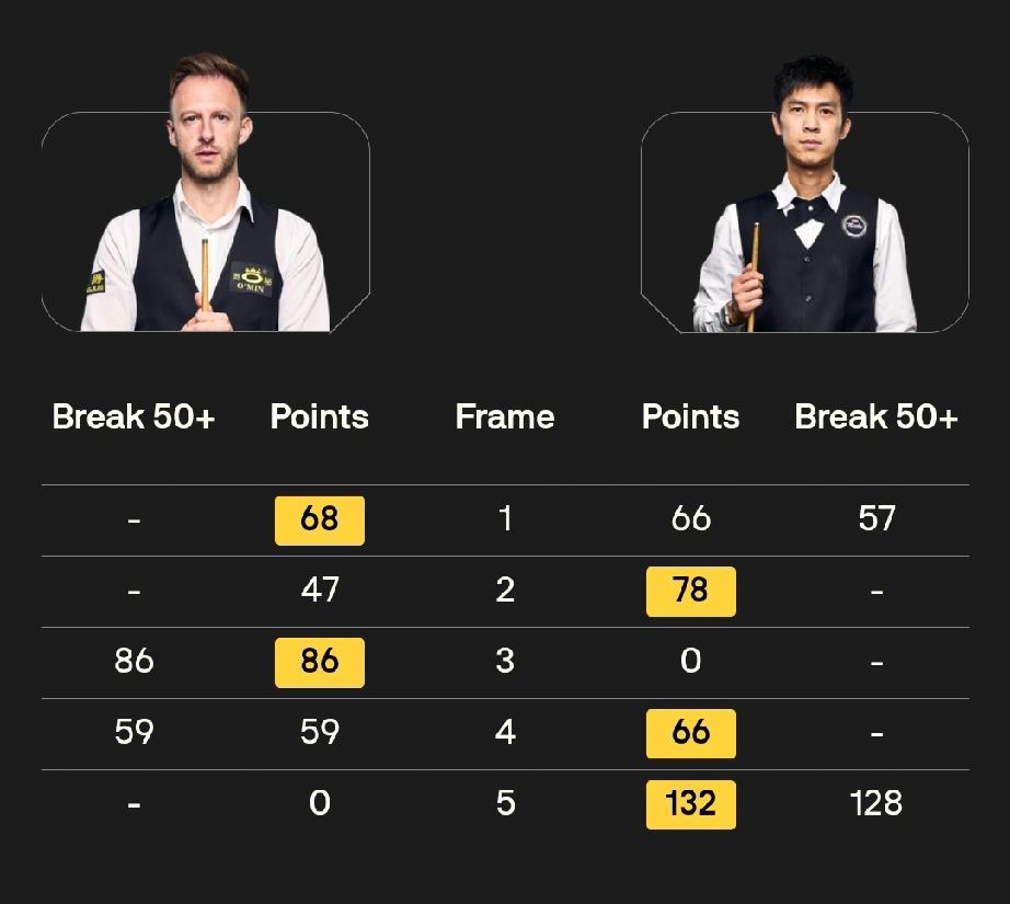 贾德·特鲁姆普 2-3 塔猜亚·乌努 2026年斯诺克世界公开赛第二场半决赛,前四局战罢,贾德·特鲁姆普和塔猜亚·乌努2-2握手言和。 比赛比较沉闷,波澜不惊,特鲁姆普打出两杆50+,塔猜亚打出一杆50+。首局比赛,特鲁姆普在被超分的情况下凭借斯诺克罚分与自由球实现超级逆转。第四局特鲁姆普单杆59分被塔猜亚极限逆转。 塔猜亚单杆128分拿下第五局,3-2领先特鲁姆普。