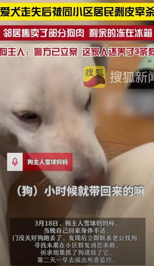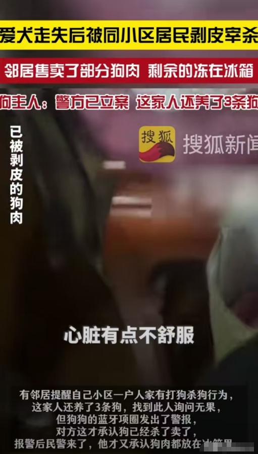 苏昆山,女子没关好门,家里的狗跑了出去,结果被邻居老人剥了皮把肉卖了。女子和丈夫找到他家,邻居还不承认,邻居女儿的男朋友甚至摔了三个啤酒瓶威胁。更可气的是邻居全程没有道歉,反而一副你能把我怎么样的态度。 这家人养的狗叫雪球,是2020年抱回家的,那时候还是一团软乎乎的奶狗,可爱又温顺,五年时间里,雪球早已不是单纯的宠物,更像是家里的一员,每天陪着夫妻俩上下班、度过平淡的日子,是这个家庭里最固定的温暖,夫妻俩对它疼得不行,走到哪儿都惦记着。 事发那天深夜,女主人加班到很晚,累得浑身乏力,回到家时几乎是倒着进门的,随手带了一下防盗门,却没注意到门差半寸没扣严,就这样匆匆洗漱后睡了过去,压根没想起检查门是否关紧,也没留意雪球的动静。 第二天早上女主人醒来后,习惯性地喊雪球的名字,可屋子里一片死寂,没有往常熟悉的回应,她心里一慌赶紧翻遍了家里的每个角落,沙发底、床底下、阳台,到处都找遍了,却连雪球的影子都没看到,那种不安瞬间席卷了她。 慌乱中她突然想起雪球的项圈上装了蓝牙定位,赶紧拿出手机打开定位,屏幕上的红点稳稳地落在了同一小区的5栋,她心里又急又喜,赶紧叫醒还在熟睡的丈夫,两人火速赶往5栋,想要找回雪球。 到了5栋门口,丈夫一边四处呼喊雪球的名字,一边询问路过的路人,可不管怎么问,都没有任何回应,没人见过他们的狗,夫妻俩急得团团转,在小区业主群里发消息、砸下几十个红包,恳求大家帮忙留意,只要能把狗送回来,绝对不找麻烦,可那些消息发出去,就像石头沉进水里,没有一点涟漪,没人回应他们。 就这么煎熬地等到第二天早上,终于有一个邻居悄悄私信了他们,语气很轻地提醒他们,5栋有个老头,平时就有抓狗吃、卖狗肉的习惯,让他们最好去老头家里看看,这句话像一盆冷水,浇得夫妻俩浑身发凉,但还是压着心里的不安和愤怒,上门去询问。 他们敲开老头的家门,客客气气地问老人有没有见过他们家的狗,可老头脸上没有丝毫异样,表情平静得像在说今天天气不错一样,一口咬定自己没见过,语气里没有丝毫慌乱,演技逼真得让人差点相信。 丈夫没有当场戳穿,而是不动声色地掏出手机,按下了雪球项圈的呼叫键,下一秒,老头家里就传出了激烈的滴滴声,声音清晰地来自屋子的角落里,夫妻俩顺着声音看去,雪球的项圈就大喇喇地摆在那里,一动都没动过。 证据就摆在眼前,再抵赖也没用,老头这才慢悠悠地开了口,轻描淡写地说,狗是他抓的,不过已经被他剥皮卖肉了,一部分卖给了别人,剩下的还放在冰箱里冻着,听到这句话,女主人眼前一黑,几乎当场站不住,心里的心疼和愤怒一下子爆发出来,却又无力到极点。 夫妻俩赶紧报了警,警察很快就赶到了现场,老头也配合着交代了自己捕杀、售卖狗肉的全过程,还从冰箱里拿出了剩余的狗肉,全程低着头,却没有说一句道歉的话,那种神情不是羞愧,而是彻头彻尾的无所谓,仿佛自己只是做了一件微不足道的小事。 警察走后老头的态度彻底变了,直接摆出一副嚣张的模样,那副神情分明就是在说,我干了又能怎样?你能咬我不成?紧接着,更离谱的事发生了,老头女儿的男朋友拎着三个啤酒瓶冲了出来,当着夫妻俩和周围邻居的面,狠狠把啤酒瓶砸在地上,碎玻璃飞了一地,明摆着就是威胁,意思是他们要是再敢来讨说法,就不会有好下场。 夫妻俩看着眼前的一幕,又气又无奈,他们只是想为自己养了五年的爱犬讨一个公道,想要一句真诚的道歉,可换来的却是拒不承认、嚣张威胁,全程没有一句歉意,那种冷漠和蛮横,比失去爱犬更让人寒心。 很多人说是女主人没关好门,狗才跑出去的,可再怎么说雪球也是有主人的,是夫妻俩依法养育的伴侣动物,老头明知道狗有主人,还强行捕杀、剥皮卖肉,本身就是错的,更不该事后如此嚣张,连一句道歉都没有,这样的做法,实在太让人可气了。