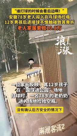 安徽铜陵,12岁男孩在公园打乒乓球时,78岁捡废品的婆婆从男孩身后经过,男孩后退