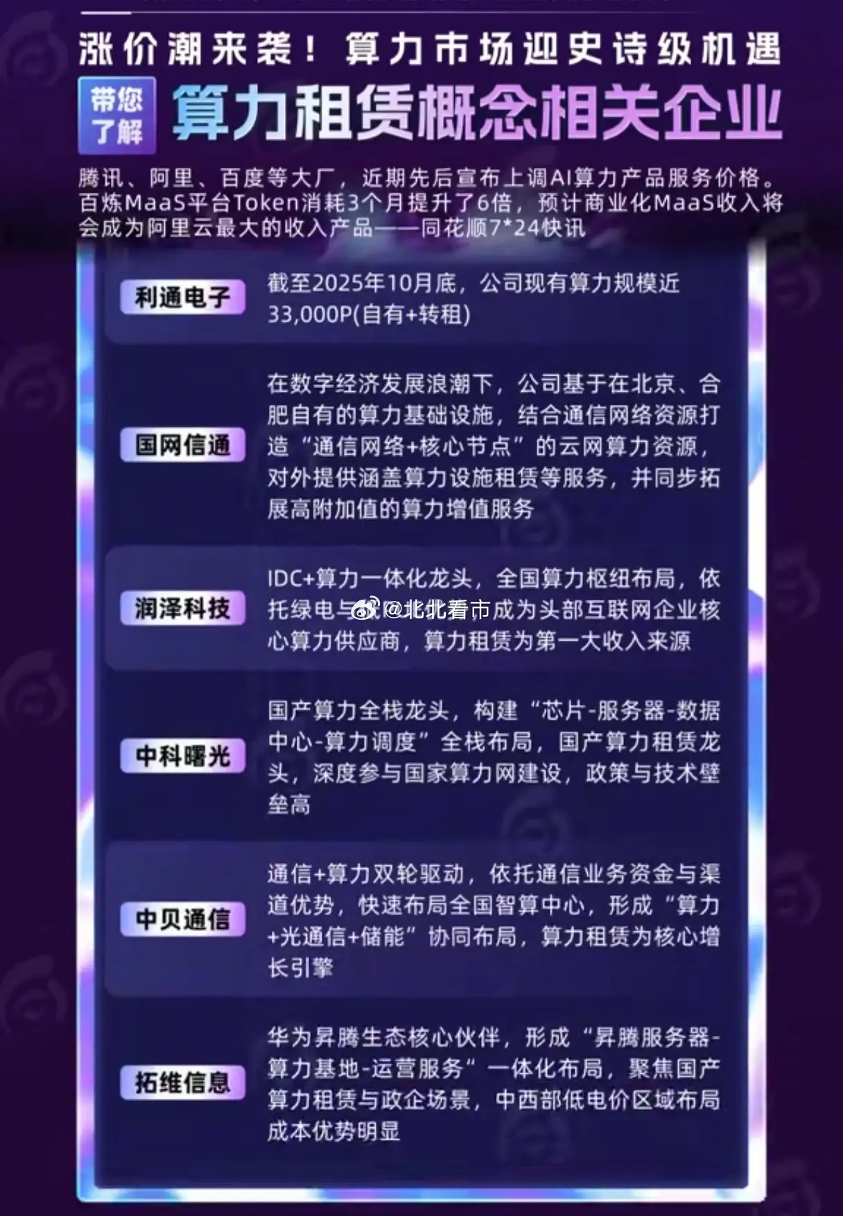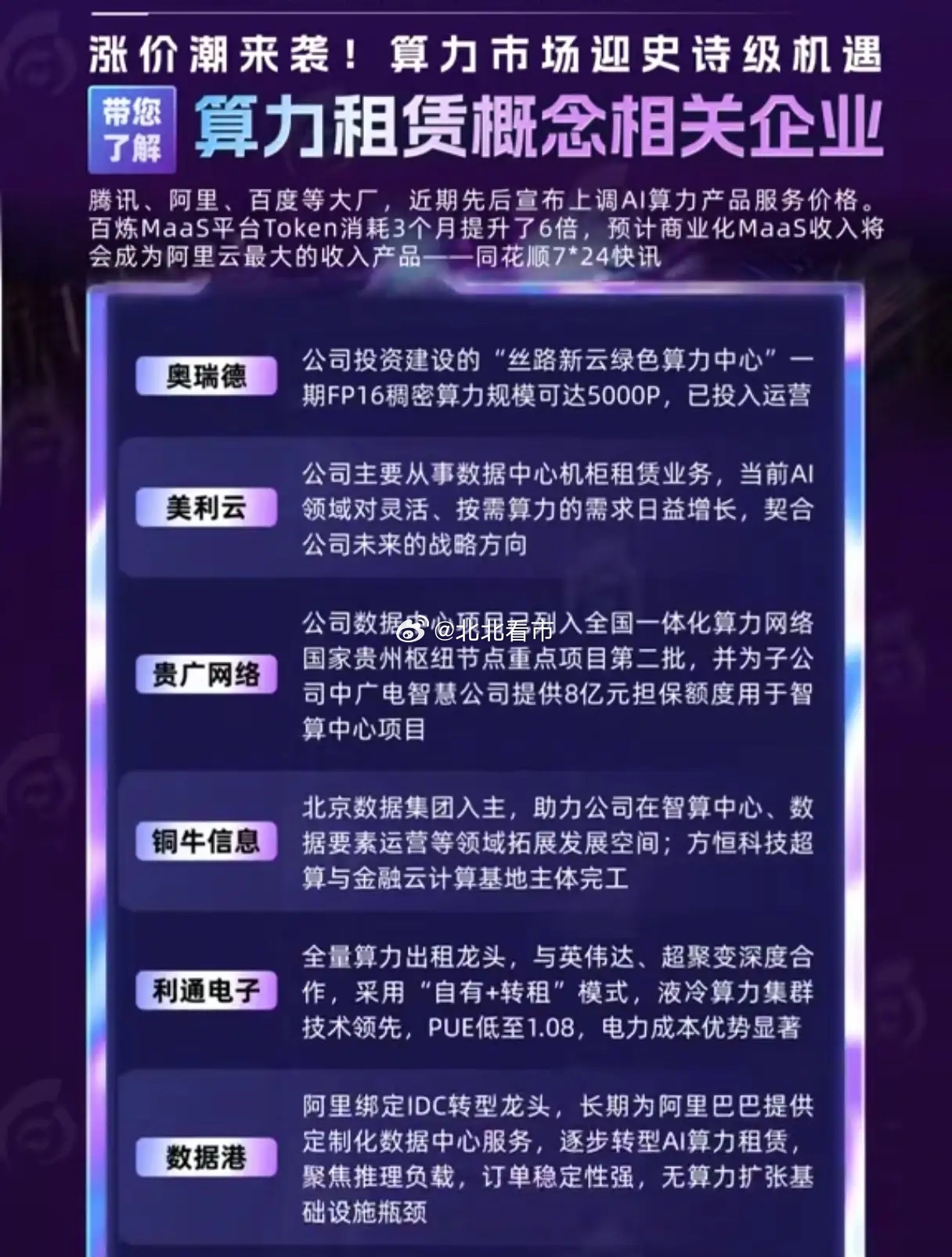 算力租赁涨价潮炸场!12家核心龙头谁能扛起AI算力新牛市?当腾讯、阿里、百度三大互联网巨头同步官宣上调AI算力服务价格,当阿里云百炼MaaS平台Token消耗3个月暴涨6倍,算力租赁赛道的史诗级行情,早已不是预期,而是正在发生的现实。AI大模型的狂飙,正在把算力从“技术名词”变成“数字石油”,而算力租赁,就是这场算力革命里最稳的“卖水生意”。这波涨价潮,到底是短期炒作,还是行业黄金十年的起点?看完这12家龙头的硬核实力,你会彻底读懂算力租赁的时代价值。先看两张图里的核心玩家:从利通电子3.3万P的全量算力规模,到鸿博股份手握英伟达DGX独家授权的生态壁垒;从网宿科技“CDN+边缘算力”的协同优势,到中科曙光“芯片-服务器-数据中心”的全栈国产布局,算力租赁赛道早已不是单一玩家的游戏,而是形成了“海外生态+国产替代+区域龙头+国资背景”的多元竞争格局。而点燃这把火的,是两个足以改写行业格局的重磅消息,彻底引爆了市场对算力租赁的信心。第一个重磅消息,是AI大模型商业化的全面爆发,直接推高算力需求。OpenAI最新财报显示,2026年Q1营收同比暴涨210%,ChatGPT付费用户突破1亿,GPT-5的训练需求直接带动算力采购量环比增长300%;国内方面,字节跳动、百度文心一言、阿里通义千问的推理算力需求,更是以每月50%的速度激增。更关键的是,大厂集体涨价:腾讯云AI算力服务最高上调30%,阿里云MaaS平台价格上调25%,百度智能云GPU实例价格全面上调,直接打通了算力租赁的盈利逻辑。过去算力租赁是“赔本赚吆喝”,现在是“量价齐升”,每一度算力都能变成真金白银的收入,行业彻底告别亏损周期。第二个重磅消息,是液冷、CPO等新技术的落地,彻底打开算力租赁的成长天花板。OFC 2026上,液冷技术成为绝对主角,利通电子的液冷算力集群PUE低至1.08,电力成本比传统风冷降低40%,直接解决了算力中心的最大痛点——能耗;中科曙光全栈液冷服务器实现1.6T光模块适配,完美适配AI大模型训练的超高算力需求;网宿科技的边缘算力+低时延网络,更是抓住了AI实时交互、自动驾驶的低时延场景,成为AI推理的核心载体。更重要的是,国家“东数西算”工程全面提速,贵州、内蒙古等西部低电价区域算力枢纽落地,润泽科技、奥瑞德等企业依托绿电优势,算力成本再降30%,形成了“东数西算+液冷节能”的双重成本壁垒,让算力租赁的盈利空间持续扩大。很多人质疑算力租赁的泡沫,但请看清一个事实:AI大模型的训练和推理,是算力租赁的刚性需求,而这种需求是不可逆的。每一个AI应用、每一次大模型迭代,都需要海量算力支撑,而算力租赁,就是给所有AI企业提供“按需取用”的算力服务,相当于AI时代的“水电煤”。鸿博股份作为英伟达生态龙头,手握DGX独家授权,H200芯片优先供货,直接卡住了高端AI训练算力的命脉;利通电子“自有+转租”模式,3.3万P的算力规模,成为英伟达、超聚变的核心合作伙伴;中科曙光全栈国产算力,深度参与国家算力网建设,是国产替代的核心力量。再看这三张图里的12家企业,更能读懂算力租赁的时代机遇:从IDC转型的美利云、数据港,到国资背景的贵广网络、云赛智联;从边缘算力龙头网宿科技,到国产算力龙头中科曙光,算力租赁赛道已经形成了完整的产业链。这波涨价潮,不是资金炒作的虚火,而是行业供需失衡的必然结果。IDC预测,2026年全球AI算力市场规模将突破5000亿美元,国内算力租赁市场增速将超过80%,行业进入黄金十年。当然,我们必须清醒提示:算力租赁赛道短期涨幅较大,部分个股存在估值过高的风险,投资者需警惕短期回调。但从长期来看,AI算力的爆发是不可逆的趋势,算力租赁作为AI产业的核心基础设施,是数字经济的“新基建”。这波涨价潮,只是算力租赁黄金时代的序幕,随着AI大模型的持续迭代、新技术的不断落地,算力租赁的成长空间才刚刚打开。当算力成为数字经济的核心生产力,当算力租赁成为AI时代的“卖水生意”,我们有足够的理由对这个行业充满信心。这不是泡沫,是AI时代给算力基础设施的必然奖赏;不是炒作,是中国数字经济崛起的核心底气。算力租赁的黄金十年,才刚刚拉开序幕。