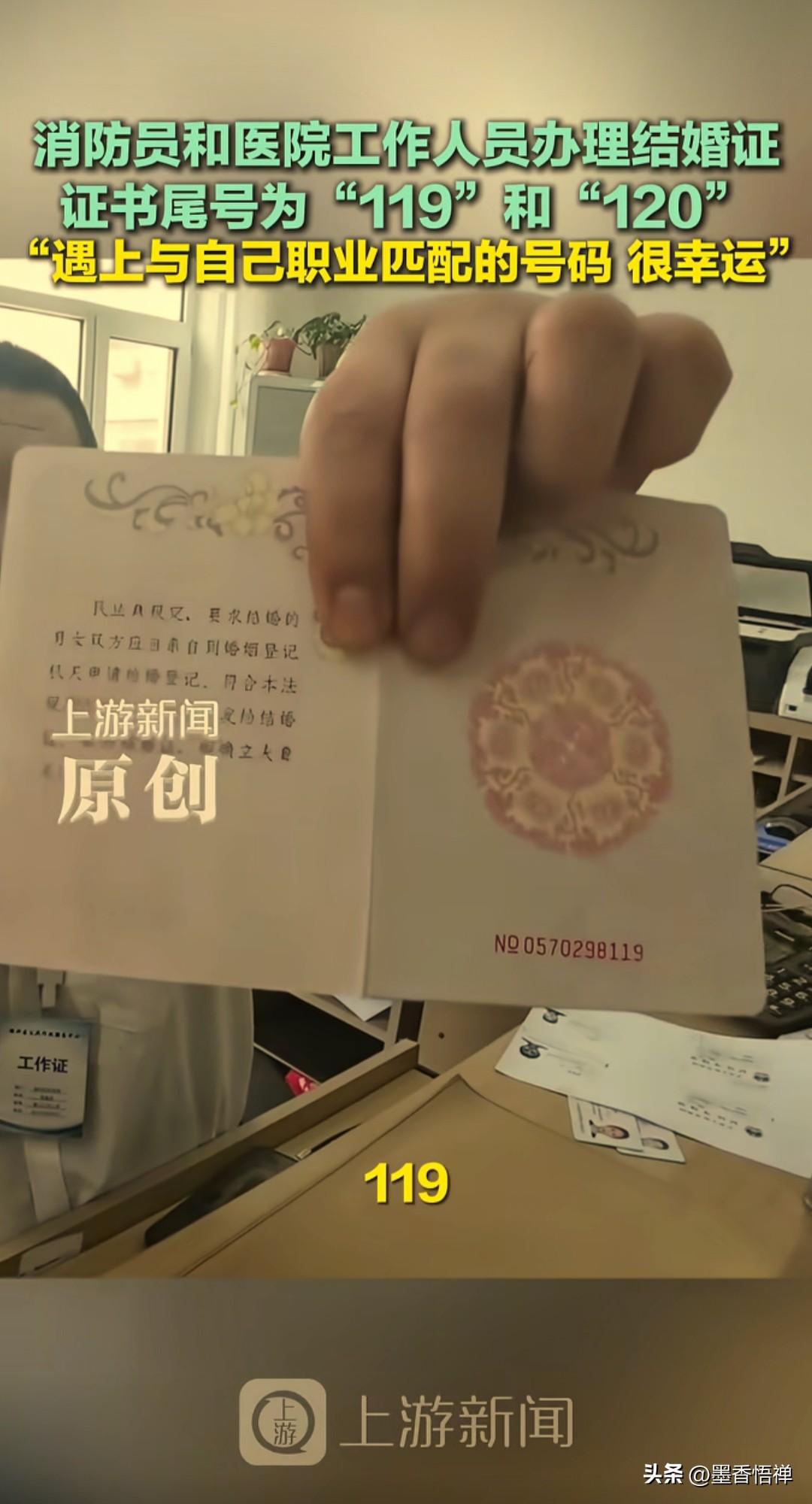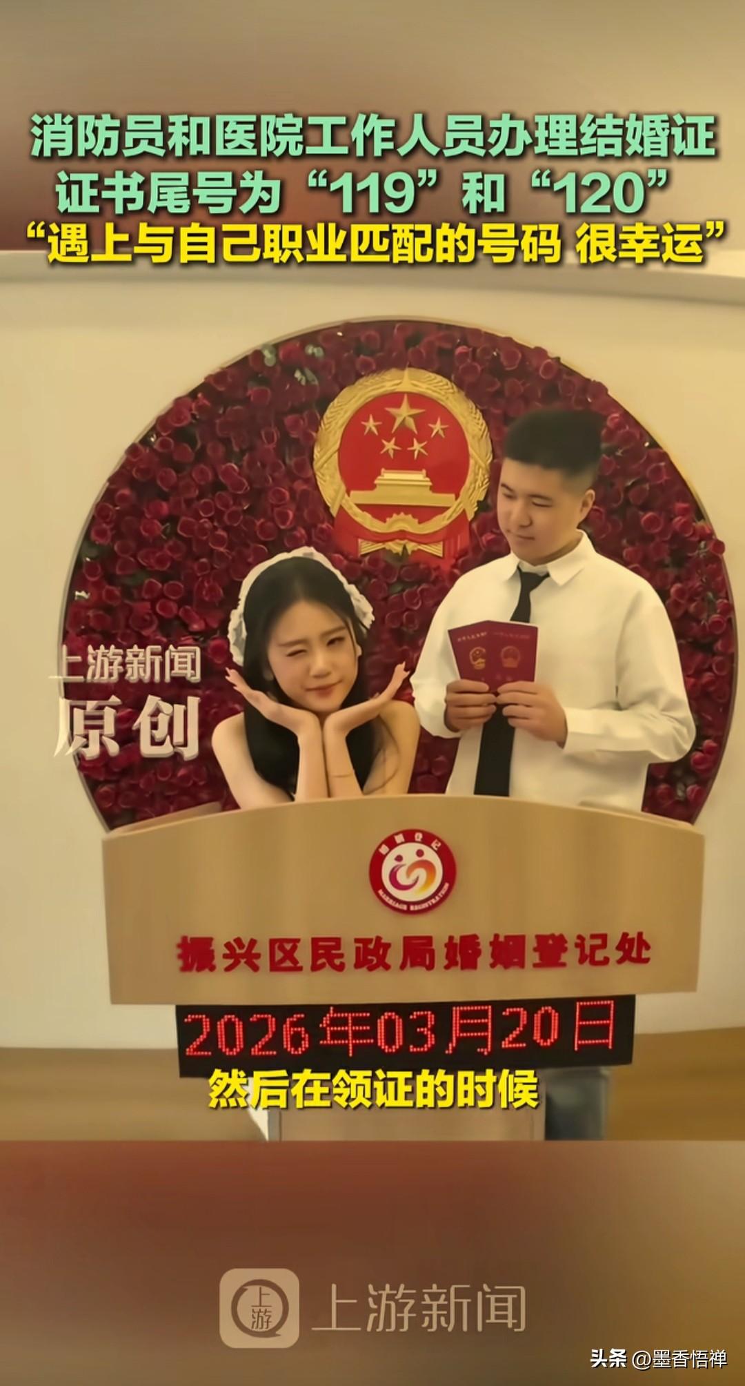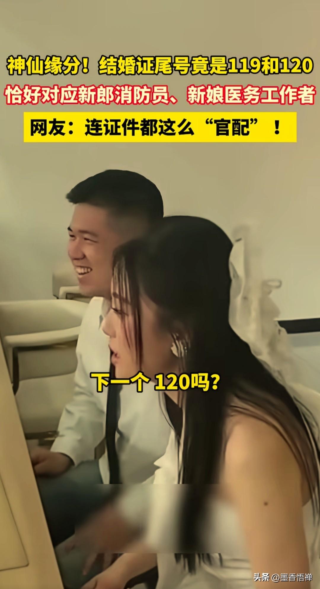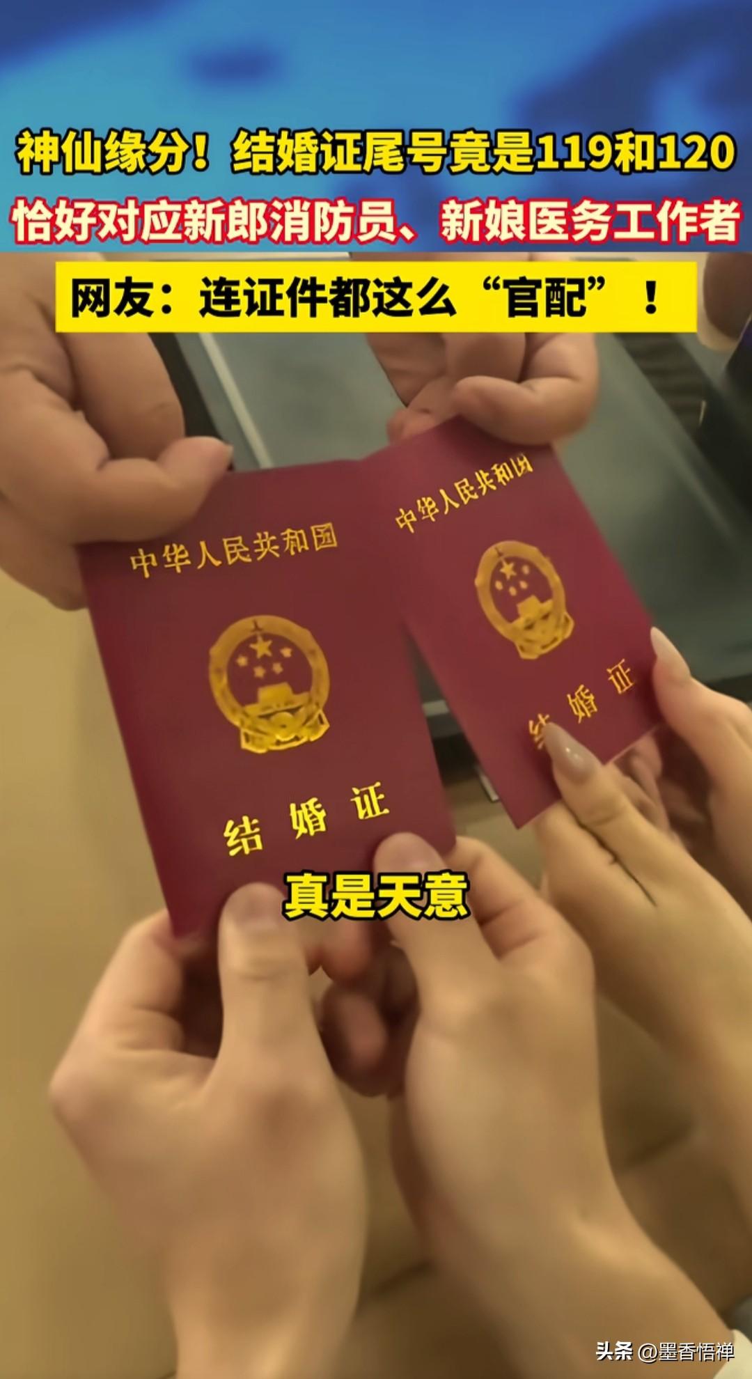 真是绝了!消防员娶医护,结婚证尾号119和120,原来真正的正缘,都会强到命运在助攻 这真的太巧了吧,巧到民政局工作人员都喊“绝了”! 最近辽宁丹东一对新人领证,直接把网友甜懵了。 新郎是消防员,新娘是医护人员, 领证的日子还是新娘特意挑的,结果领完证一看,新郎的结婚证尾号是119,新娘的是120,完美对上俩人的职业。 连工作人员都在旁边说:“号是系统随机出的,我真没挑号啊!”“干这么多年,头回见这么巧的!” 有网友看完直接破防,写下一段最戳心的话: 世间最浪漫的巧合,莫过于你是119,她是120。 你赴汤蹈火,她救死扶伤, 你守护人间烟火,她守护生命微光。 往后余生,彼此守护,平安喜乐,新婚快乐。 两个人都是为别人拼命的职业, 如今被命运用一串数字悄悄牵了线,这哪是领证啊,这简直是老天爷亲自盖章的“官配”! 祝福他们,一辈子平平安安,甜甜蜜蜜!