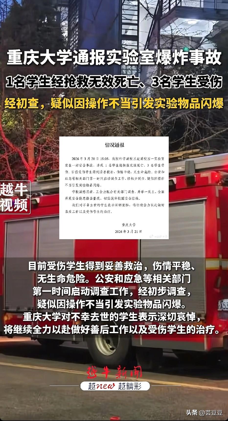 几个家庭的天塌了!重庆大学一实验室发生爆炸,造成 1 死 3伤,家长该有多伤心呀! 3 月 20 日晚8 点传来一声爆炸,重庆大学虎溪校区,材料学院电子显微镜实验室内一片狼藉,门口还有大片血迹。 目前还不知道是什么原因导致。实验室发生爆炸,一名学生在爆炸中身亡,还有 3 名学生受伤。 寒窗苦读十余载,好不容易走进顶尖学府,带着家人的期盼与自己的理想,本该奔赴前程,却发生了这样的事,父母如何能承受? 愿逝者安息,伤者早日康复,希望所有高校都能彻查隐患,保证学生的生命安全。 大家说这是究竟是意外呢还是有安全漏洞?