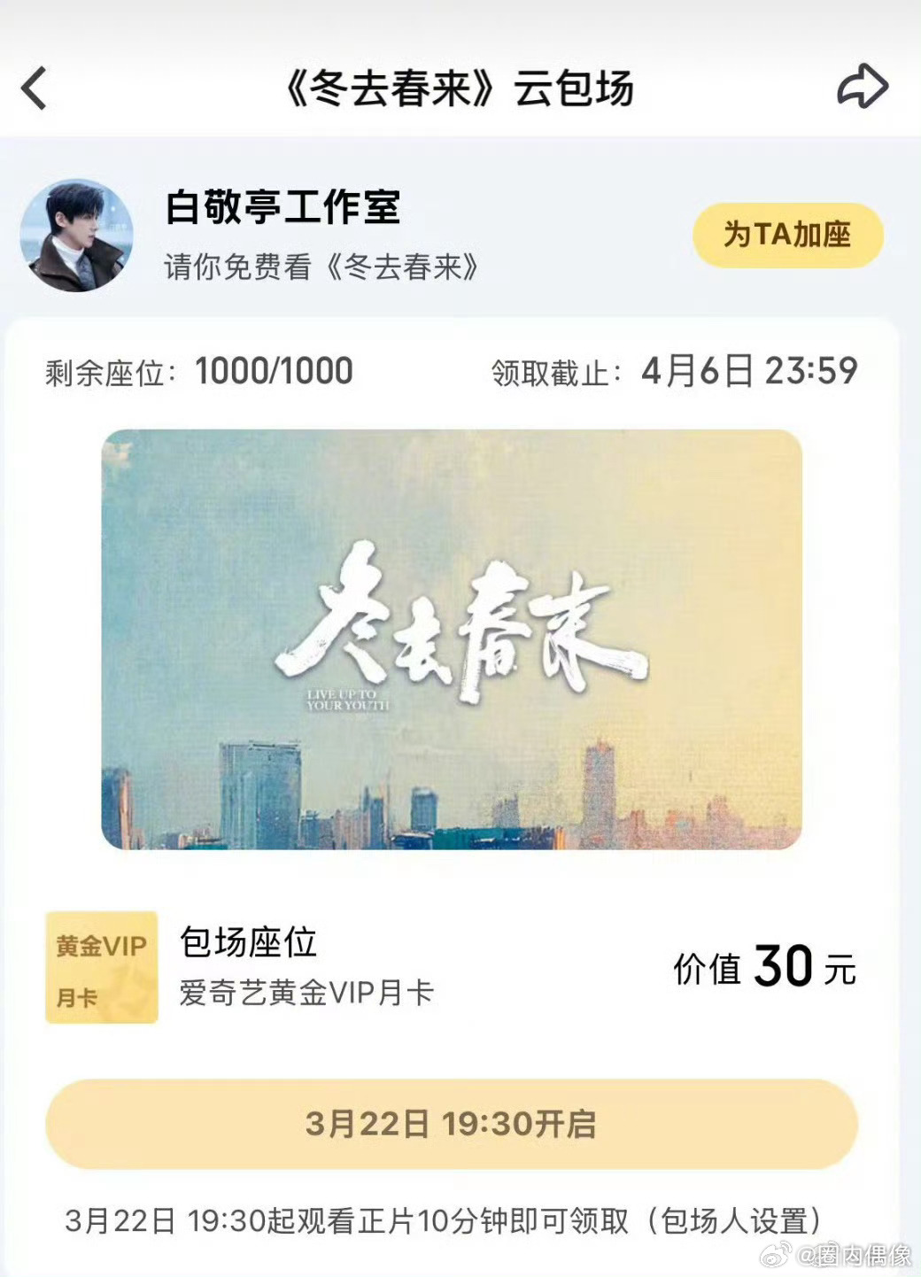 白敬亭包场章若楠冬去春来以延为定,双向奔赴太好嗑🥹白敬亭包场支持章若楠新剧《冬去春来》,暖心应援超有排面!寒冬终散,春日已至,一起追剧赴约~