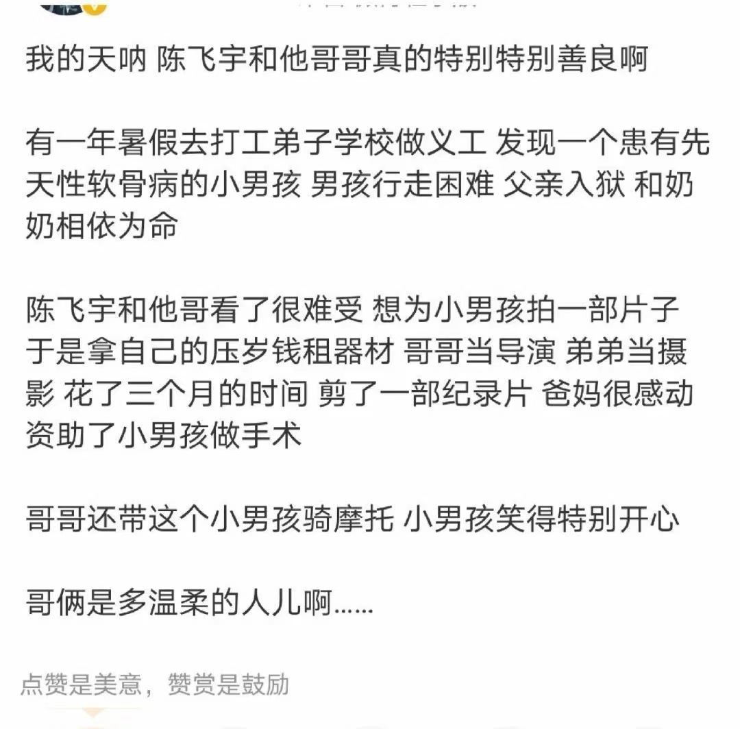 陈飞宇内娱礼宝男陈飞宇和哥哥曾花压岁钱拍了一部纪录片被陈飞宇的细节温柔狠狠温柔到了,从小就心怀善意,用压岁钱助力公益,用镜头守护弱小。步入演艺圈后依旧保持纯粹,礼貌待人,细心照顾身边人,戏里用心塑造角色,戏外温柔真诚,这样的人怎么能让人不喜欢