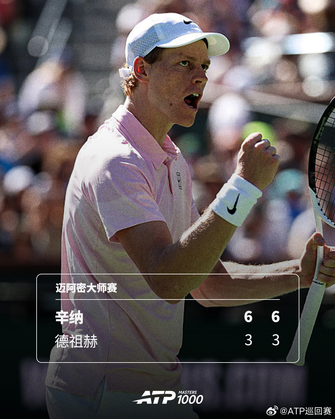 ATP1000 迈阿密大师赛第二轮,2号种子辛纳直落两盘以6-3 6-3战胜德祖赫,轻松收获开门红,也取得近期7连胜,接下来他将对阵穆泰与马哈奇的胜者。