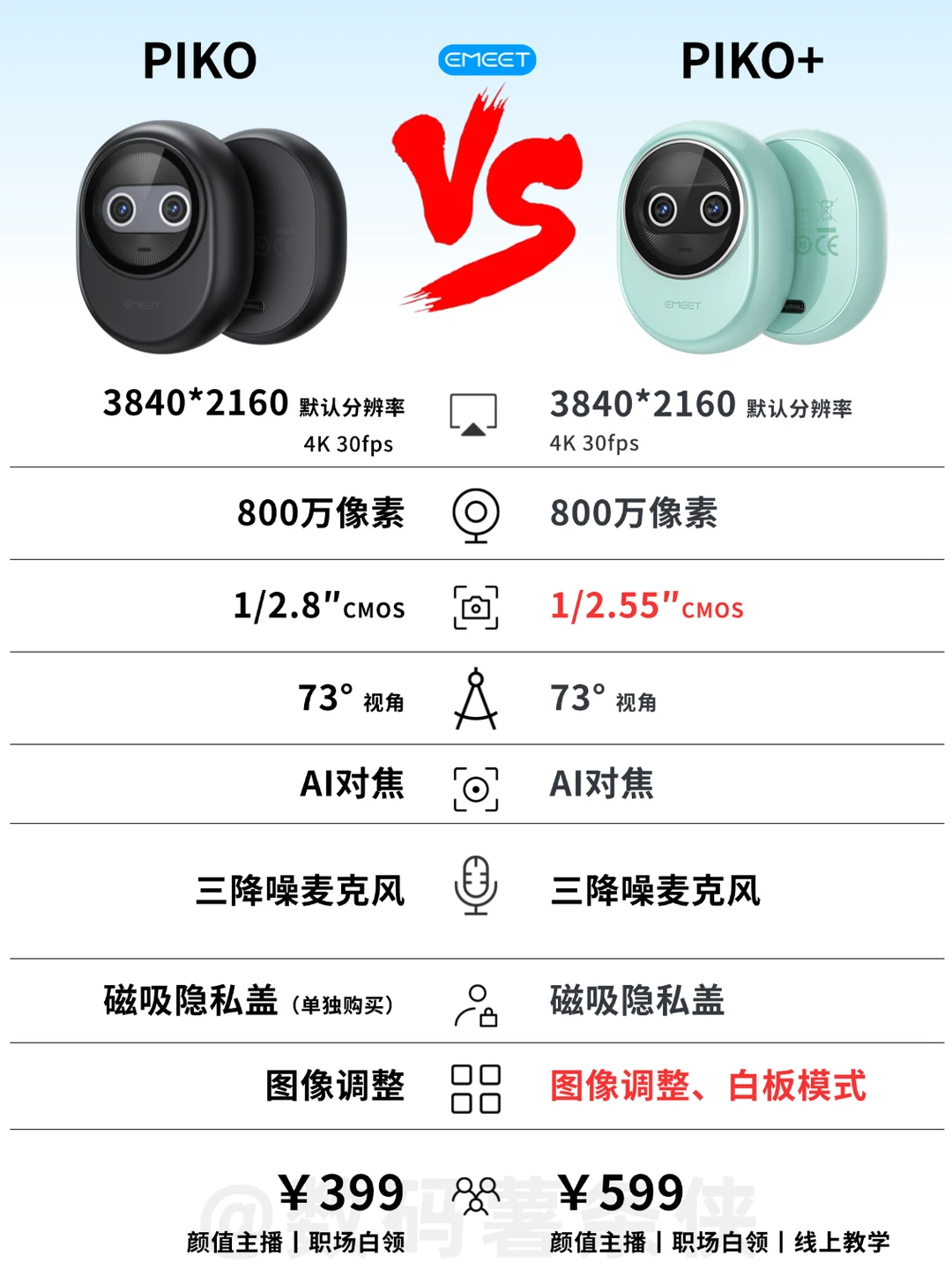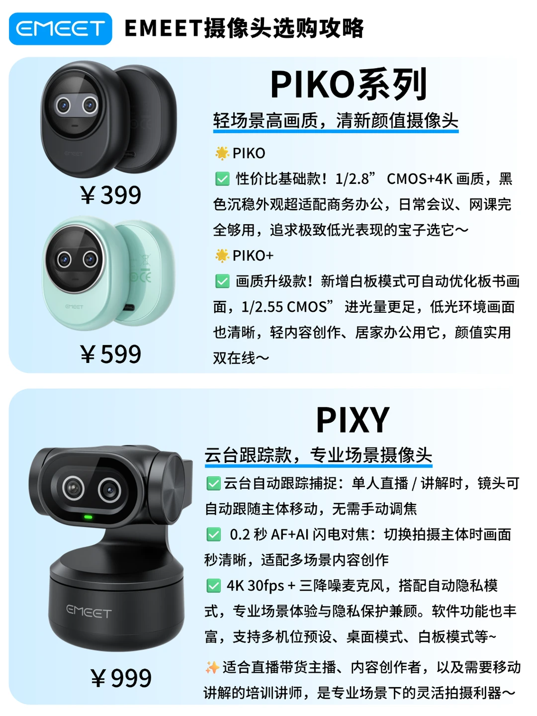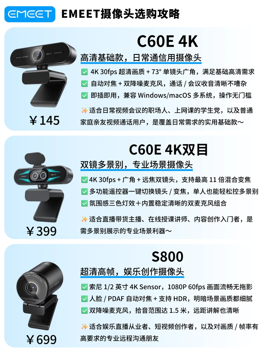 宝子们催的EMEET摄像头直接对比来啦!把热门款的参数差异+适配人群整理得明明白白,按需抄作业不踩雷~