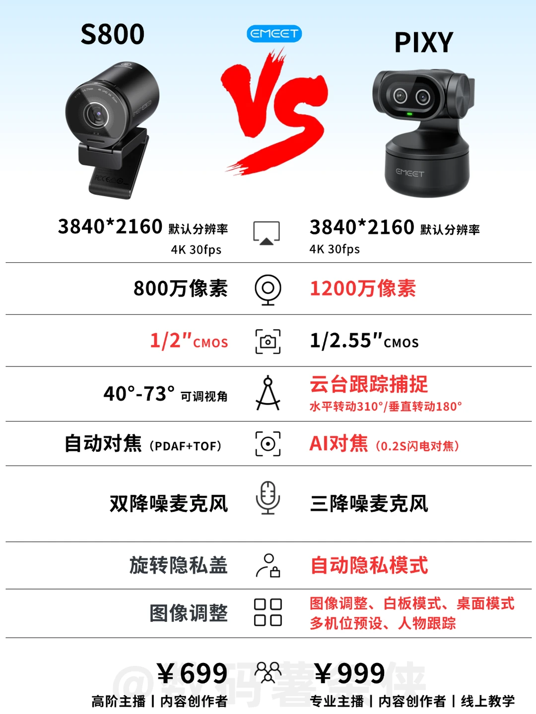 ●功能:S800 仅基础图像调整;PIXY 带白板 / 桌面模式 + 多机位预设等功能,线上讲课 / 直播切景更高效