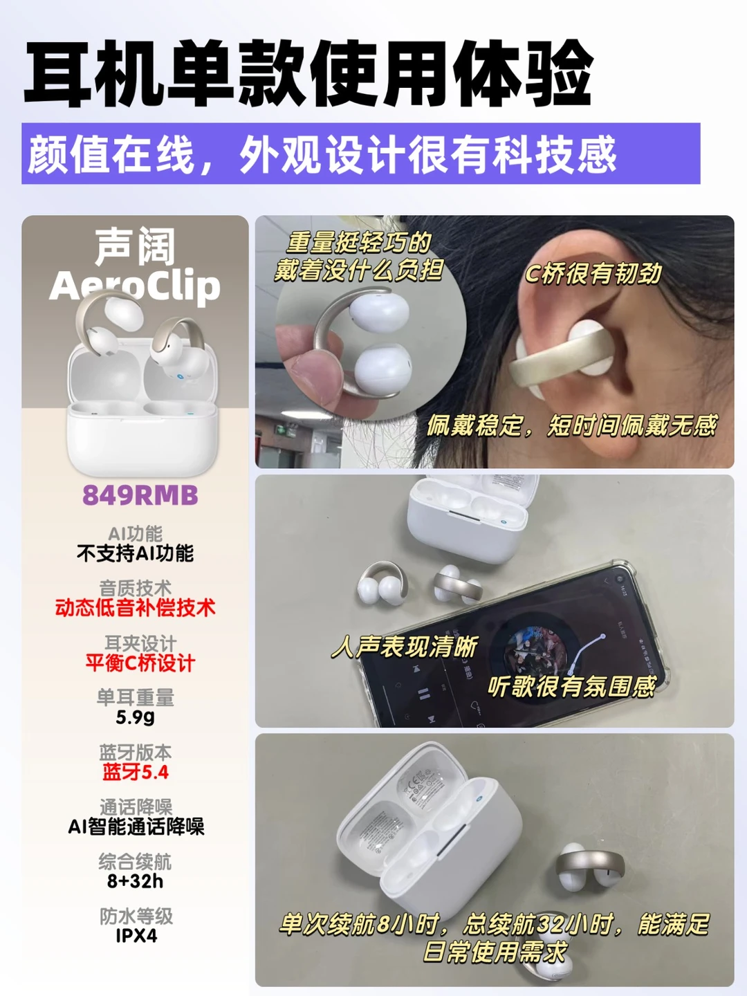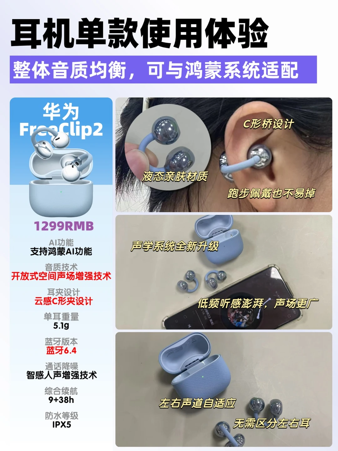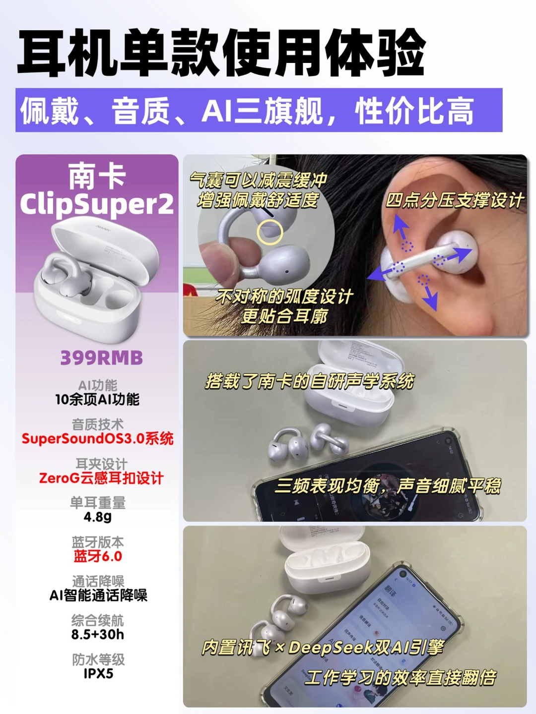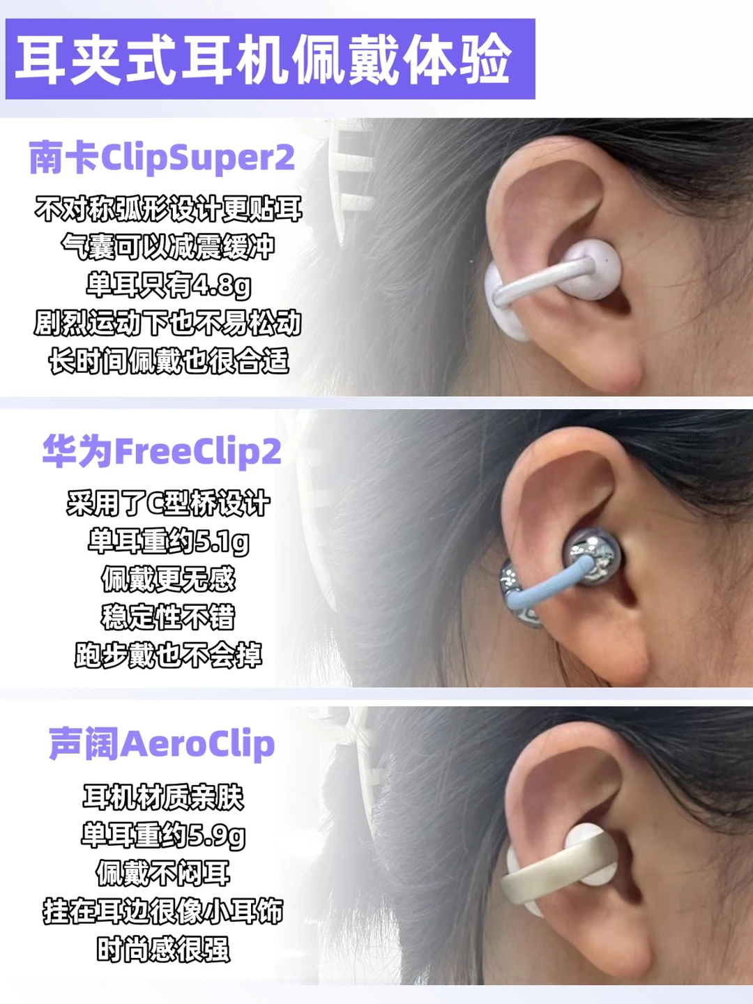 2025 年真的被开放式耳机拿捏了!这次我一次性入手了三款今年刚出的开放式新品,想跟大家聊聊我这段时间的真实使用感受~想入手的宝子,直接看这篇就够啦! 【南卡ClipSuper2】 这款三百多的价格,这个价位段真的很强悍,戴着很舒服,它的发声单元有一个小小的气囊,可以减震还能缓冲,单耳只有4.8g,戴着更轻松,固定单元还有不对称弧形设计,戴着更贴耳,跑步也不会晃动。它还搭载了自研的声学系统,声音表现细腻,三频均衡,各种曲风都可以适配。耳机还有10多项AI功能,工作学习都用得上,大大提高了效率。 【华为FreeClip2】 华为这款耳机相比前一代小巧了不少,看起来也更精致了,耳夹还是采用了C型桥的设计,耳机的重量更轻了,只有5.1g,佩戴轻松,戴着也很稳定。在音质上搭载了10.8mm的动圈单元,低频比上一代更有澎湃感,人声也很清晰。它还支持头部操控,比如点头接听、摇头拒绝,通勤的时候也不用摸耳机,用着特别方便。 【声阔AeroClip】 耳机白金的佩戴很好看,很大气又很有潮流感。耳机也采用了C型桥设计,单耳的重量大约为5.9g,不会又强烈的累赘感。戴着也不会闷耳,而且挂在耳边很像一个耳饰,很好看。耳机搭载了12mm的动圈单元,人声的表现很清楚,听歌的时候也很有氛围感。续航方面,单次续航8小时,总续航32小时,日常使用完全够用。