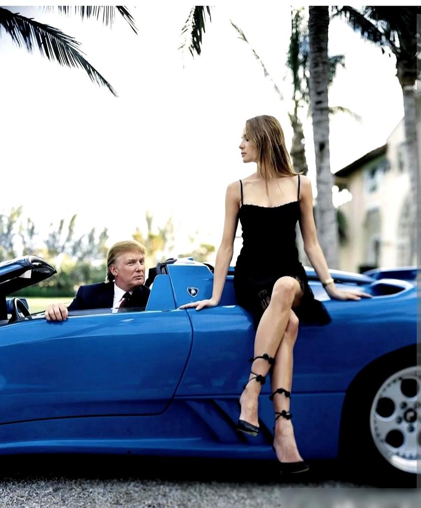 2000年前后,特朗普和梅拉尼娅在海湖庄园拍英国GQ的时尚大片。背景那台亮蓝色兰博基尼,可不是普通豪车。 是1997款Diablo VT Roadster,美国市场总共只造132辆。特朗普靠和品牌的特殊关系,定制了官方没出过的蓝颜色,车门还刻着自己的专属名字。 他开了四年,还被拍到在加油站自己动手加油。2024年这车拍卖,拍出110万美元的价,直接刷新了这款车的拍卖纪录。 之前2016年同款才卖46万,这溢价说白了就是沾了特朗普的身份光。 那时候他还是地产大亨加真人秀明星,车库堆的全是奢华座驾,和后来从政的路子对比挺鲜明。