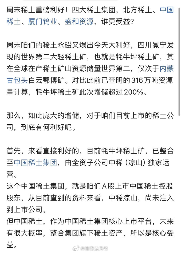 周末稀土迎来重磅利好,四川冕宁牦牛坪稀土矿资源量大幅增储,已成为全球第二大在产轻稀土矿山。在北方稀土、中国稀土、厦门钨业、盛和资源这四大稀土集团中,中国稀土和盛和资源受益相对更大,北方稀土和厦门钨业受益有限。具体分析如下: