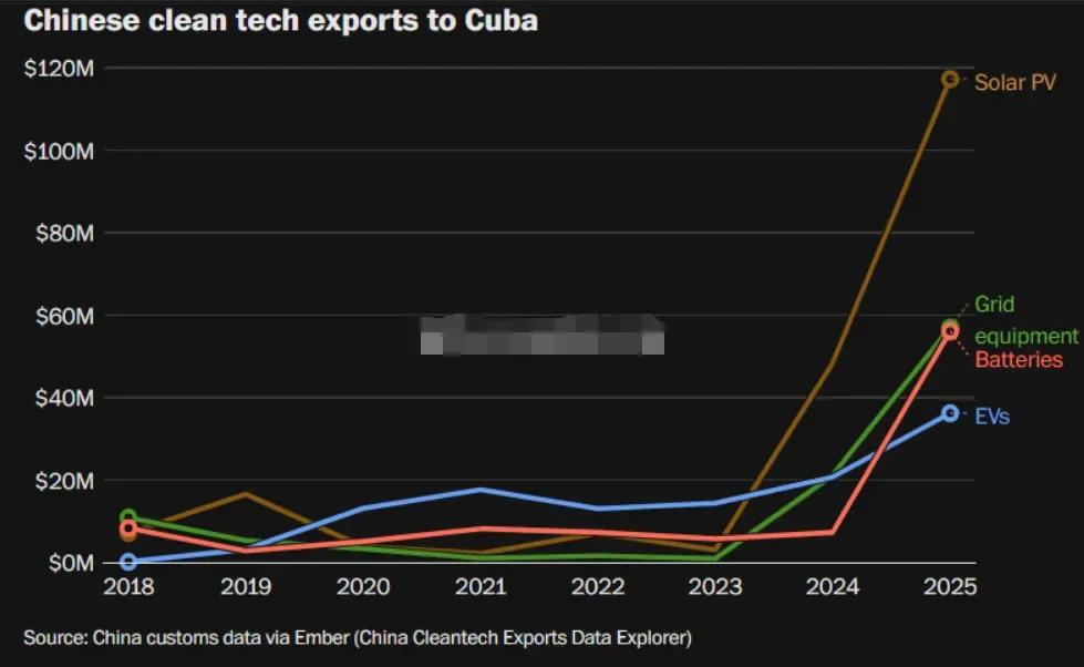 一份来自英国能源智库“Ember”的报告,估计让白宫某些人失眠了。 事情是这样的:美国一直想通过切断石油供应来卡古巴的脖子,这招以前很管用——没了油,工厂停工、路灯熄灭,社会停摆。 可这次剧本变了。 数据显示,中国对古巴的太阳能设备出口额从2023年的500万美元飙升至2025年的1.17亿美元。中国企业不仅卖设备,还派人过去帮着装、帮着建。 结果呢?卫星图像看得清清楚楚:大片太阳能板在古巴铺开了。本月,古巴光伏发电首次突破900兆瓦——这个数字连很多发达国家都做不到。 美国想掐断油轮,中国帮古巴装上了“永不断电”的太阳能。 这一招叫降维打击:美国封锁的是“传统能源的流量”,中国建设的是“新能源的产能”。太阳能板不需要经过美国控制的海峡,一旦铺开,阳光就是源源不断的免费电力。 白宫官员看完报告脸色铁青——不是因为他们失败了,而是因为他们发现,过去那套封锁逻辑,已经跟不上这个时代了。