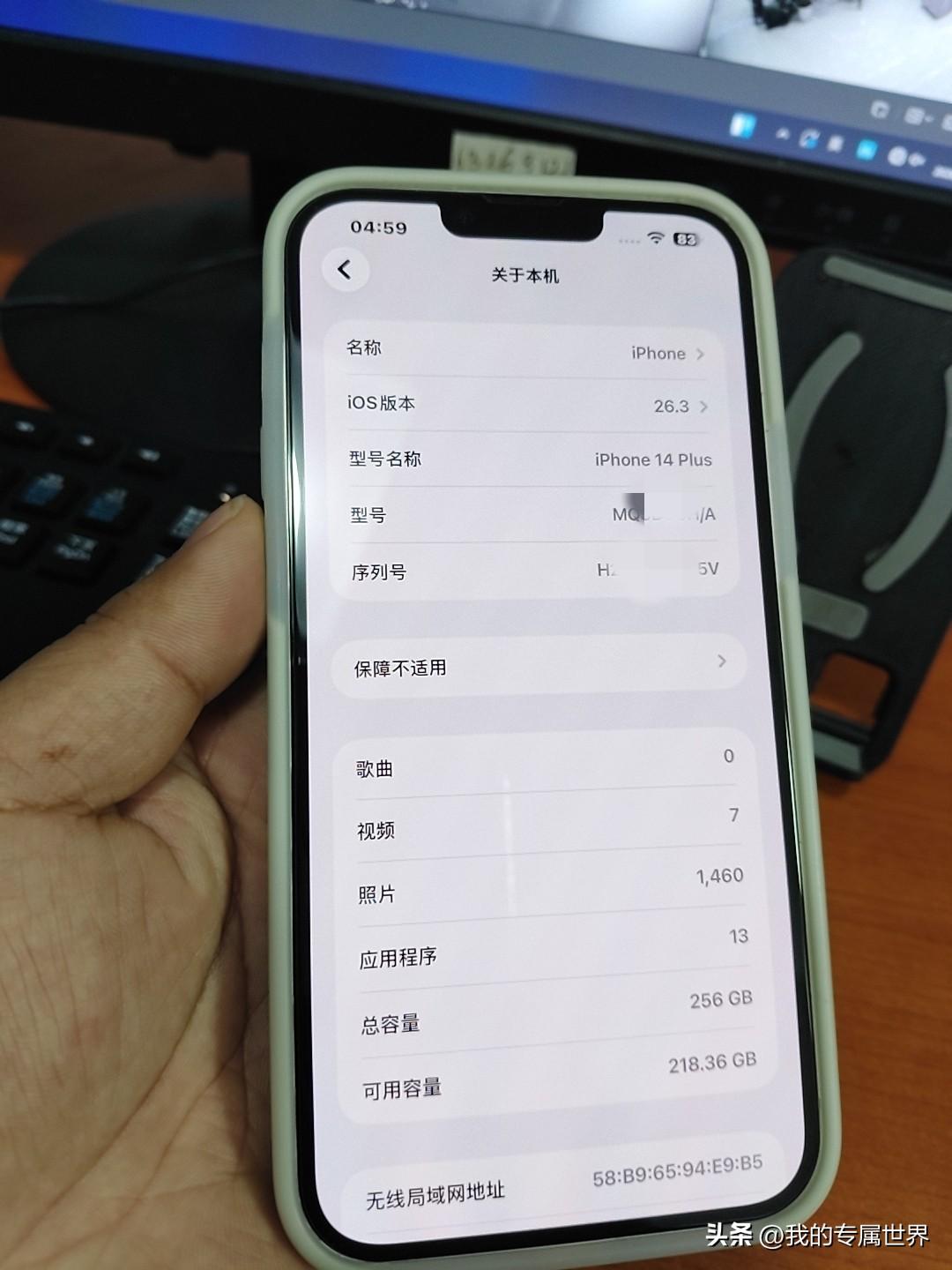 我这个月花2820块买了部2024年8月30号过保的苹果14plus白色256g,除了过保修,手机就是新机,电池效率100,去手机店让查了爱思,充电次数总共9次,电池效率显示97,应该是长时间放置没用的原因,我这人不跟风,别人都花七八千买最新款的苹果17,我就买几年前的,我自己又不打游戏,平时就是拿来拍拍视频什么,我记得2023年苹果14plus刚发布的时候256g内存都快8000块,那时在北京做保安一个月4000块,七八千的价格可以说望而兴叹,可望不可及,现在花2820块买了个基本全新机也挺划算,拍视频还是非常清楚,我现在有两个手机,vivoy300pro+为平时生活工作主力机,去年4月份1500块买的,主要看上了7300毫安的大电池,说来这手机价格也抗打,都过去快1年,二手价格还能卖1000多点,我之前也用了3款苹果手机,感觉除了拍视频是确实牛掰,其他的使用起来我感觉不如安卓,所以平时当备用机拍拍视频什么的。