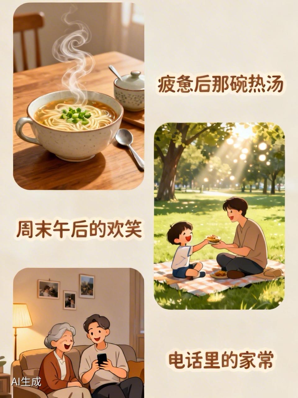 幸福是疲惫一天后,回到温馨小窝,爱人端上的那碗热汤,冒着腾腾热气,暖了胃更暖了心;是周末午后,阳光慵懒地洒在身上,和孩子一起在公园草坪上嬉笑玩耍,笑声在空气中肆意弥漫;是父母身体康健,在电话那头唠着家常,虽平淡却满是牵挂。简单来说,幸福就是生活里那些微小而确定的满足,是柴米油盐中的细水长流,是每一个被爱包围的瞬间。