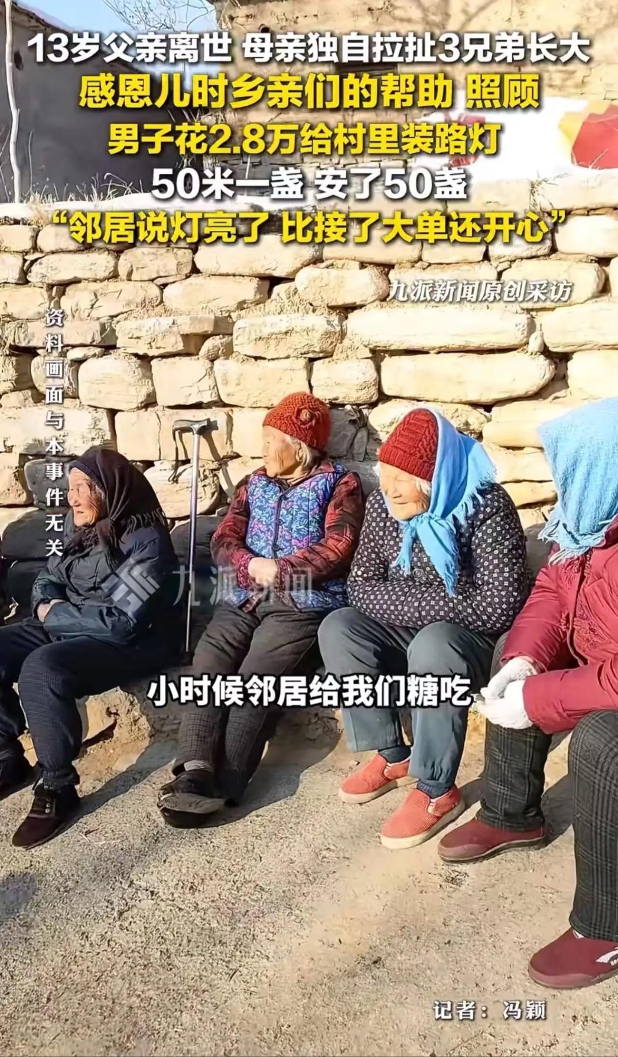 早年丧父靠吃“百家饭”长大的35岁宿州男子花2.8万为全村装路灯:这束光,终于照回来了 宿州农村的夜,曾经很黑。没有路灯,村民晚上出门得打手电筒。但今年春节,村里第一次亮起了16盏太阳能路灯,从村头一直亮到村尾。照亮这条路的,是村民张伟的2.8万元积蓄。 “没有他们,我可能活不到今天” 1999年,张伟13岁。在外打工的父亲意外离世,家里的顶梁柱塌了。母亲体弱多病,下面还有弟弟妹妹。村里20多户人家,你家端一碗饺子,我家送一袋米,西家给弟弟妹妹凑学费。“是村里人一口一口,把我养大的。”张伟说,这份情,他记了22年。 “混出人样,第一个要报答村里” 为了养家,他16岁就去城里工地搬砖。睡过大通铺,吃过冷水泡面。从学徒干到包工头,在城里安了家。日子好了,他第一个念头就是回村。“每次开车回来,看到村里黑漆漆的,老人孩子晚上不敢出门,心里就特别不是滋味。” 2.8万,买来全村20年的光明 去年年底,他瞒着家人,联系了厂家。16盏太阳能路灯,从定货、运输到安装,他一手包办,花了整整2.8万元。有人说:“你不如直接分钱给大家。”他摇摇头:“钱花了就没了。这灯,能亮十几年。我要让村里晚上,也和城里一样亮堂。” 腊月廿八,路灯第一次亮起。村里老人聚在灯下聊天,孩子笑着追逐光影。70岁的王奶奶抹着眼泪:“小伟这孩子,光宗耀祖啊!” 网友热议:这是最贵的“灯”,也是最亮的心 消息发到网上,瞬间刷爆同城。网友“宿州老李”评论:“2.8万对他不是小数目,这是一颗金子般的心。” 更多本地网友表示:“这是我们宿州人的骄傲!”“正能量,看哭了。” 一束光,照亮了夜路,也照见了人心 他没有盖高楼,也没有修祠堂。他用最朴实的方式,把当年收到的温暖,变成一束实实在在的光,还给了这片土地。善良是一场轮回,你播种的温暖,总有一天,会以另一种方式,照亮你自己。 互动区: 你的家乡,有没有这样一个让你念念不忘的恩人,或一件温暖的小事?来说说你的故事。 如果你是张伟,你会选择为村里做什么?装路灯、修路,还是其他?
