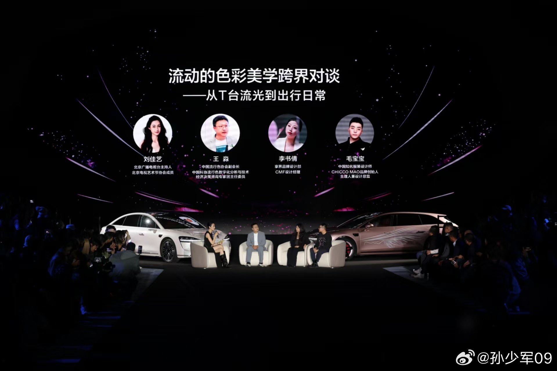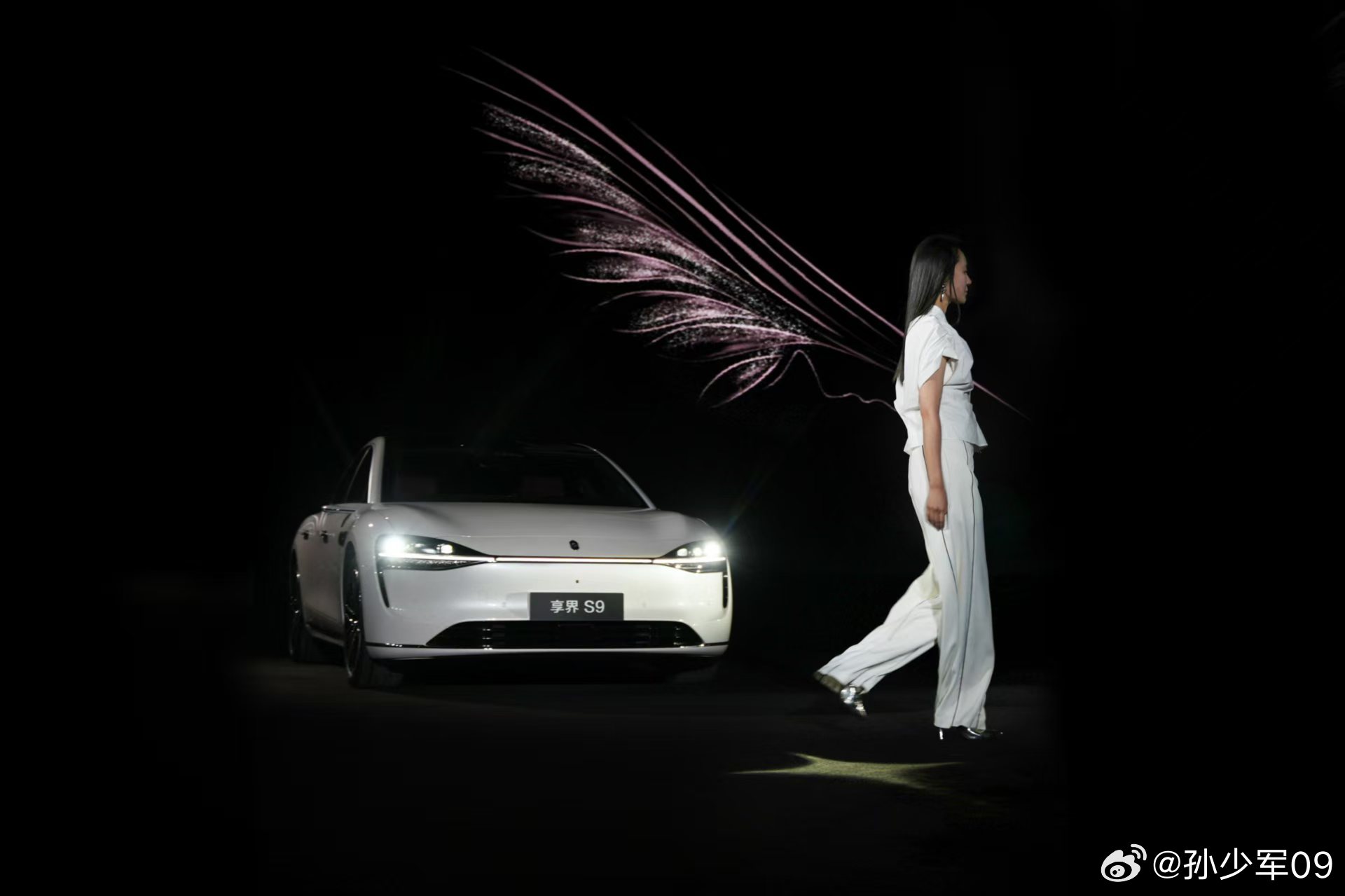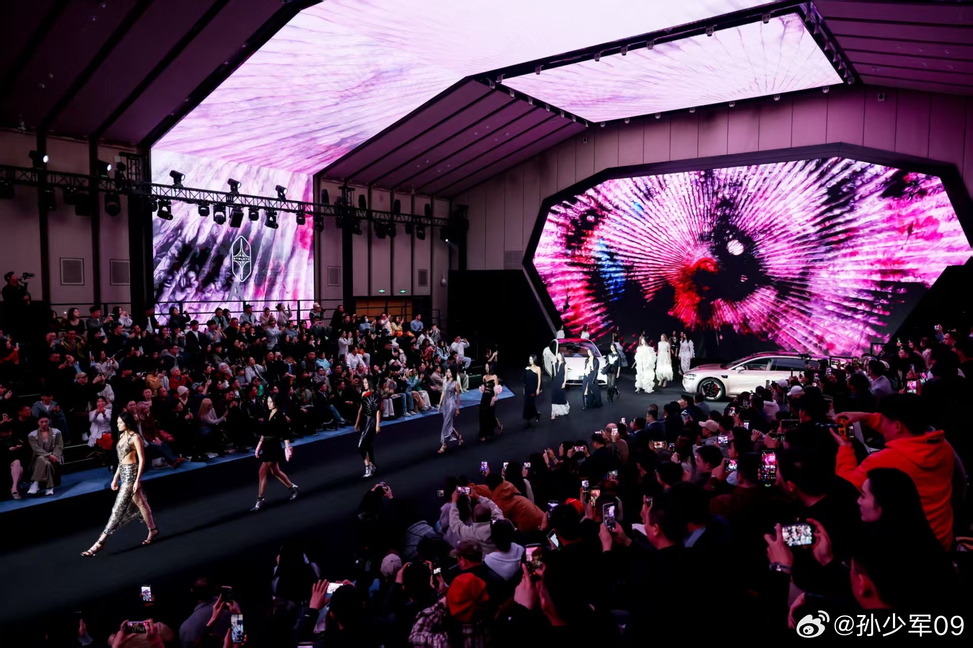 2026北京时装周享界时尚之夜暨「寰宇春辰」发布会,享界S9T星玫粉、享界S9月绒白车型身着高定艺术车衣C位登场,联名时装秀以车色为灵感原点,将科技美学的理性秩序