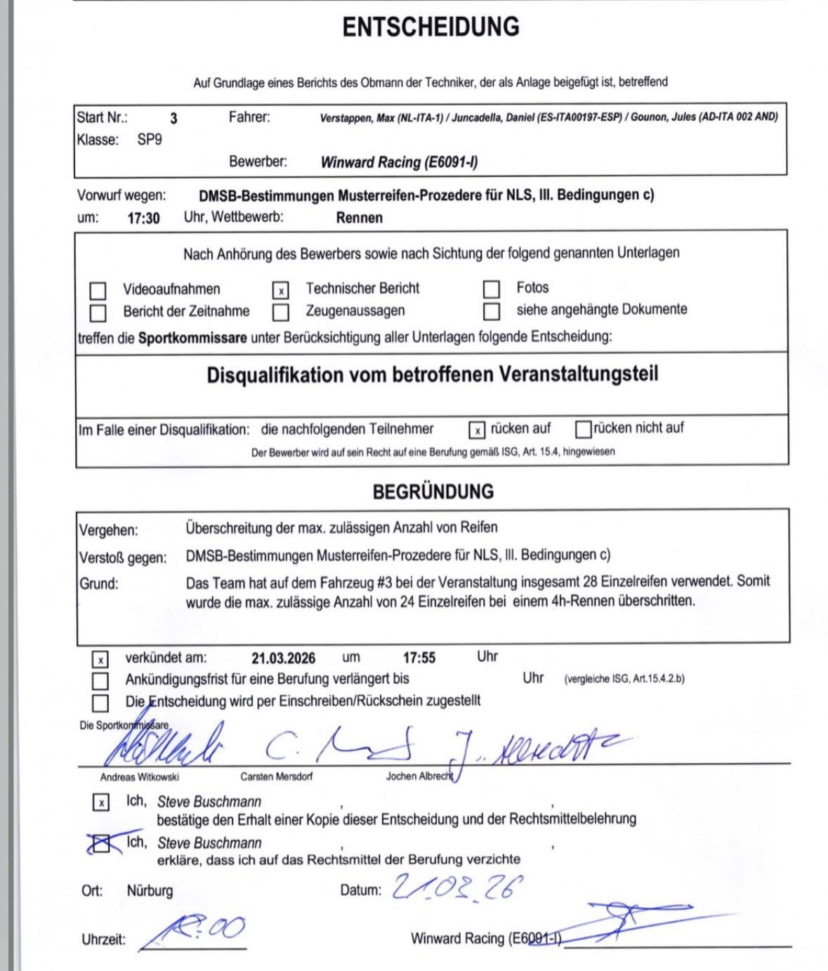 3号梅赛德斯-AMG由于轮胎使用数量违规被取消NLS2成绩。