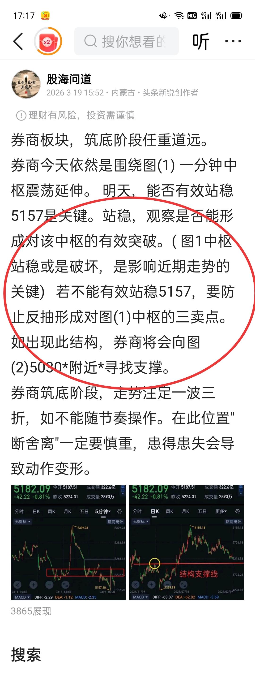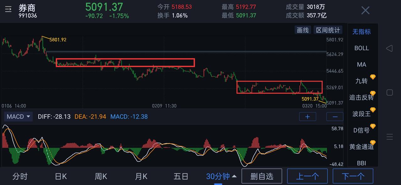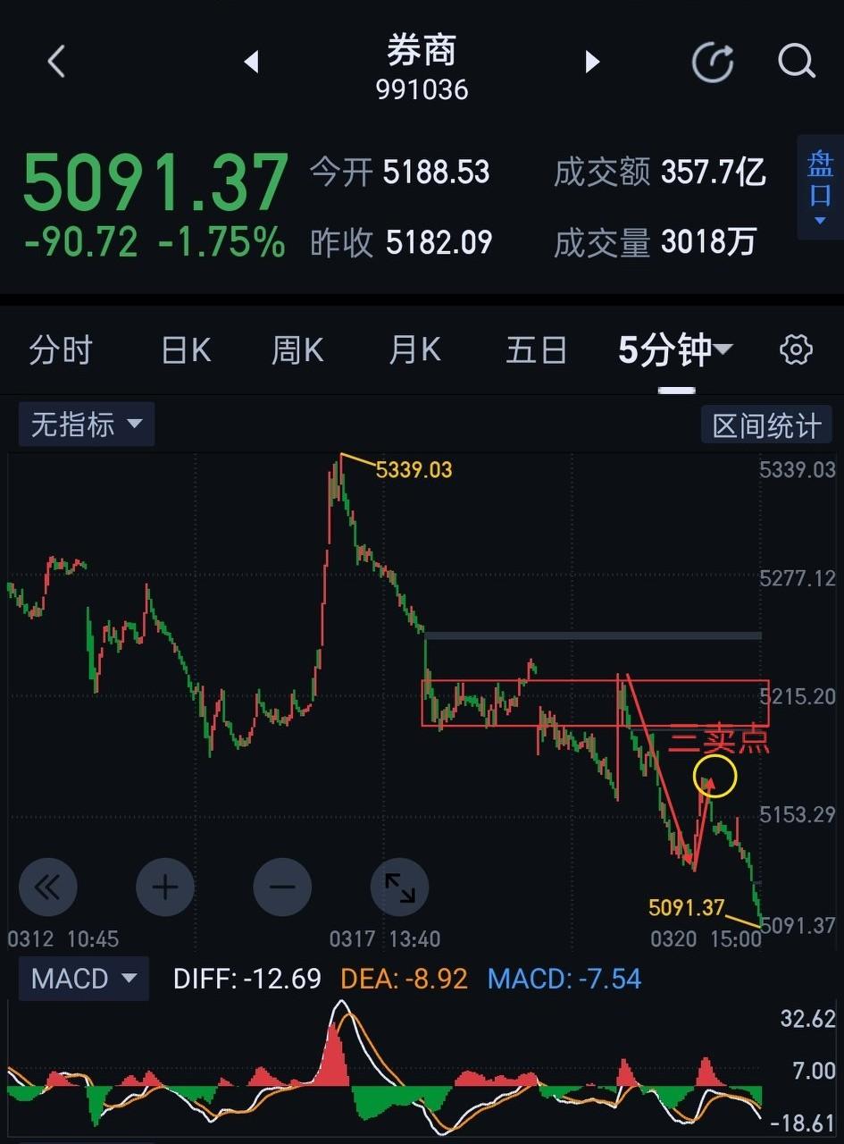 券商板块,下周有望获得关键支撑。 券商目前距离图(1)的结构支撑咫尺之遥。下周支撑线附近多空大概率会有一番争夺。从5801开始的日线一笔下在图(2)已形成两个五分钟级别中枢。当下结构处于第二个中枢的向下离开段。如果图(2)形成趋势背驰,可期待新的日线一笔上产生。 细节上,图(2)开始于5339的向下离开段,在次级别(图3) 已形成一个一分钟中枢。周一能否有效站稳5121是关键。站稳,开始于5339的向下离开段有望结束。若不能站稳,图(3)则会构建第二个一分钟中枢,后续可等形成背驰后,再择机参与。(由于周五图已形成明显的向下离开段,为了便于观察,所以今天把该离开段单独分解。这与周四对周五形成三卖点的判断并不违和)